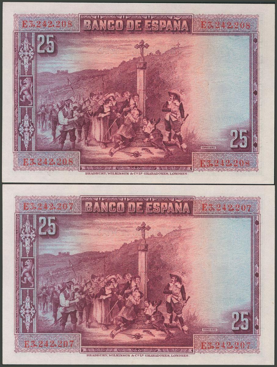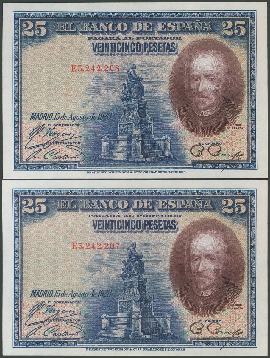 25 Pesetas. August 15, 1928. Correlative couple. Series E. (Edifil 2017: 353). Preserves all the original sizing. Uncirculated.