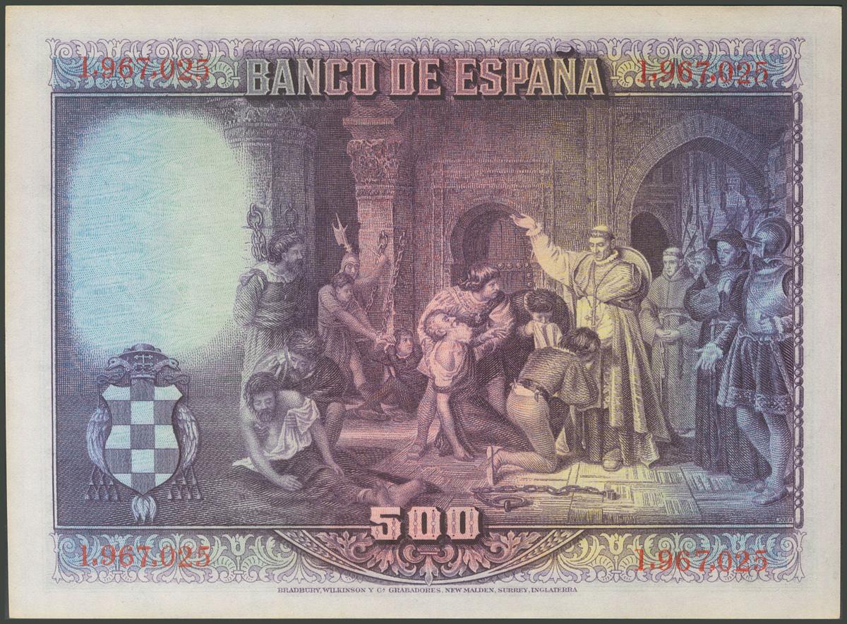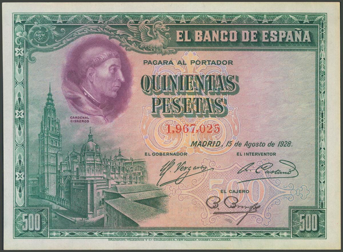English 500 pesetas. August 15, 1928. Without series. (Edifil 2017: 356). Original sizing. Almost Uncirculated.