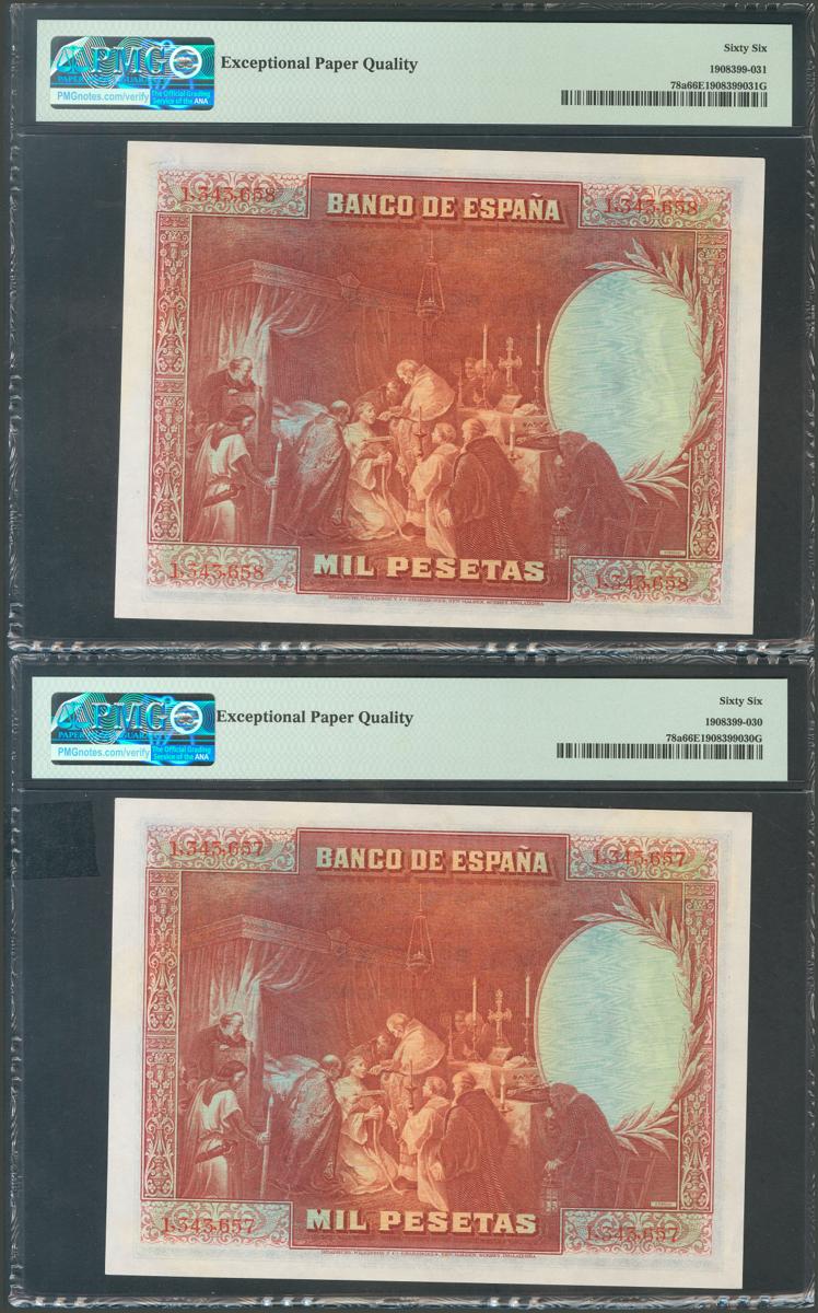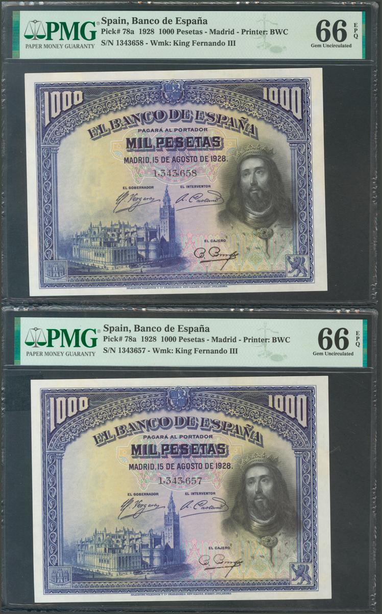 1000 Pesetas. August 15, 1928. Correlative couple. No serie. (Edifil 2017: 357). Unusual like this, keeping all its original finish. Uncirculated. PMG66EPQ packages, both.