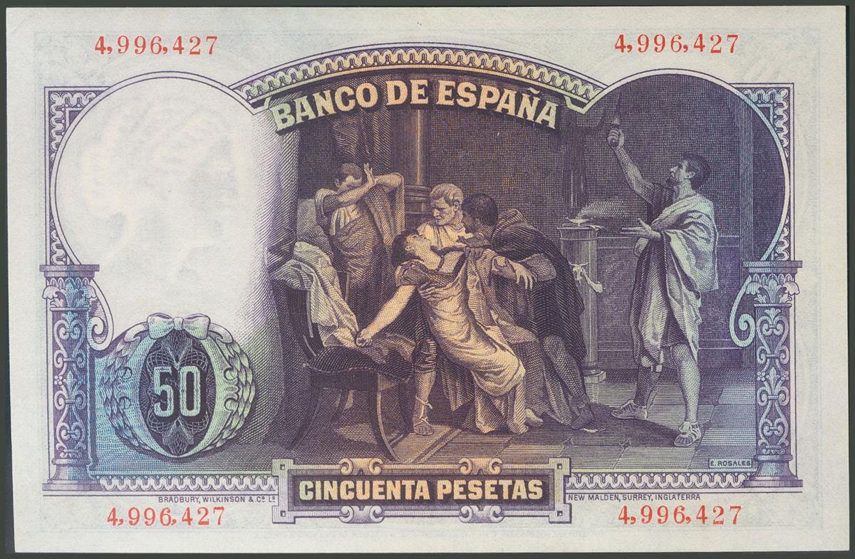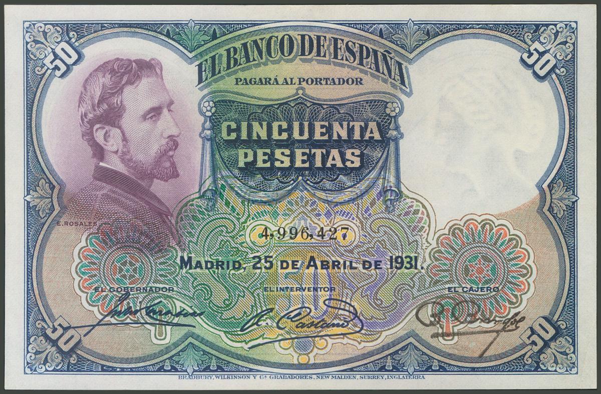 English 50 Pesetas. April 25, 1931. Without series. (Edifil 2017: 359). It presents all its original sizing, very attractive. Good Extremely Fine.