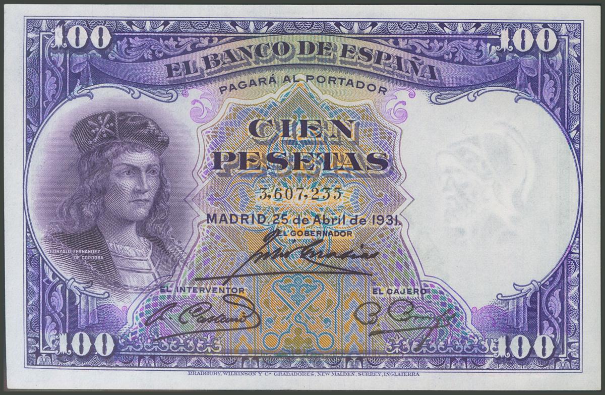 English 100 pesetas. April 25, 1931. Without series. (Edifil 2017: 360). It retains all its original size. Uncirculated.