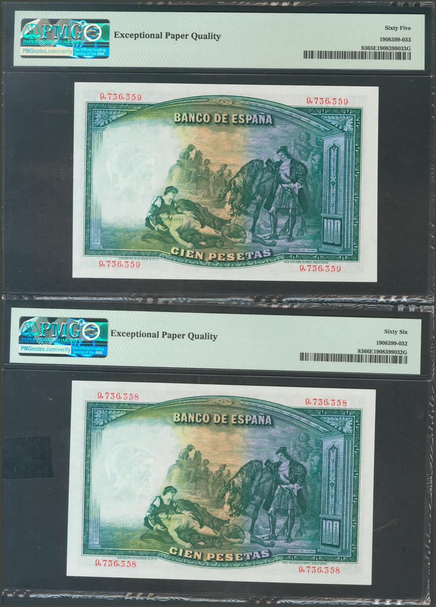100 pesetas. April 25, 1931. Correlative pair. No serie. (Edifil 2017: 360). It retains all its original size. Uncirculated. PMG66EPQ / 64EPQ packages.