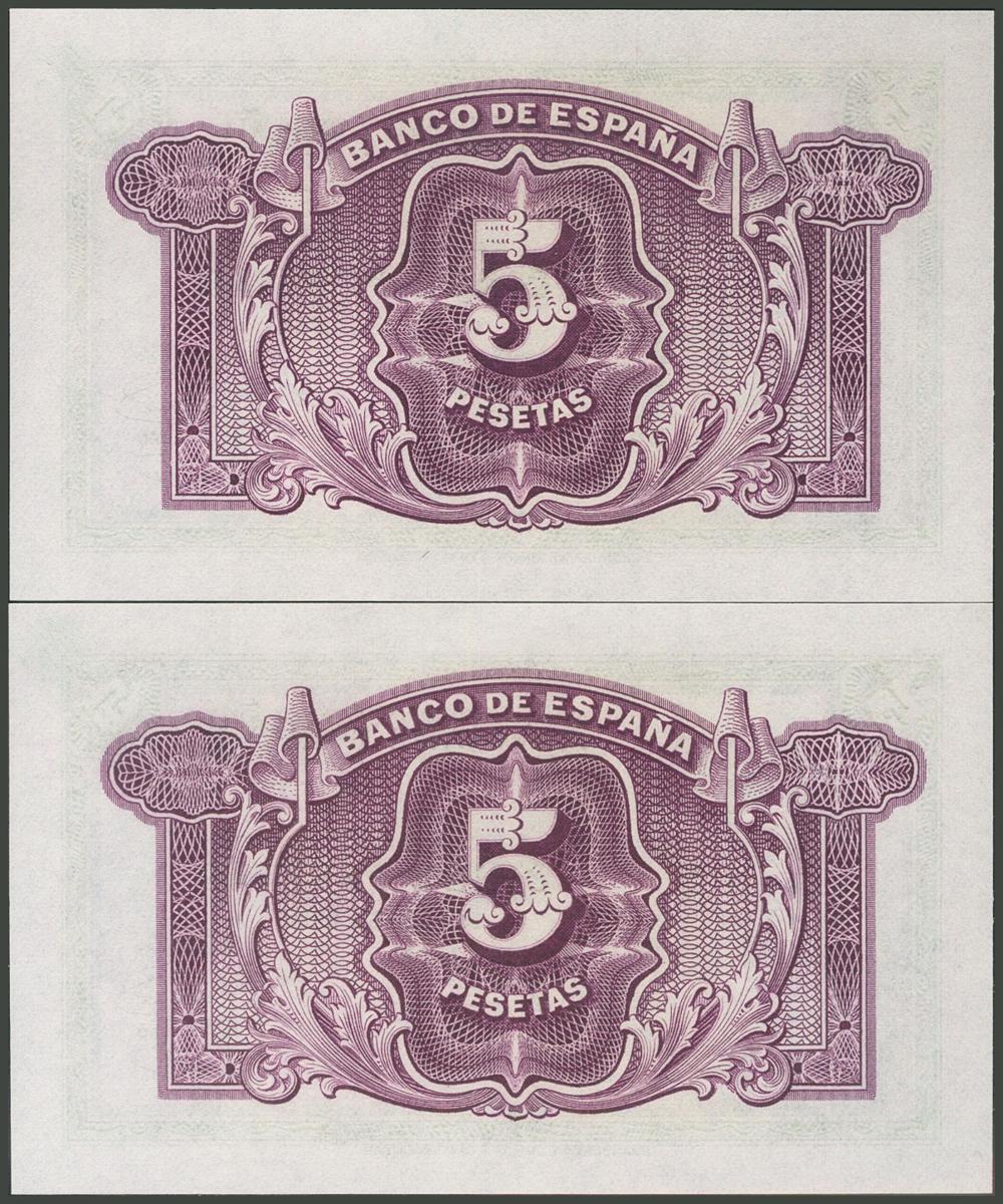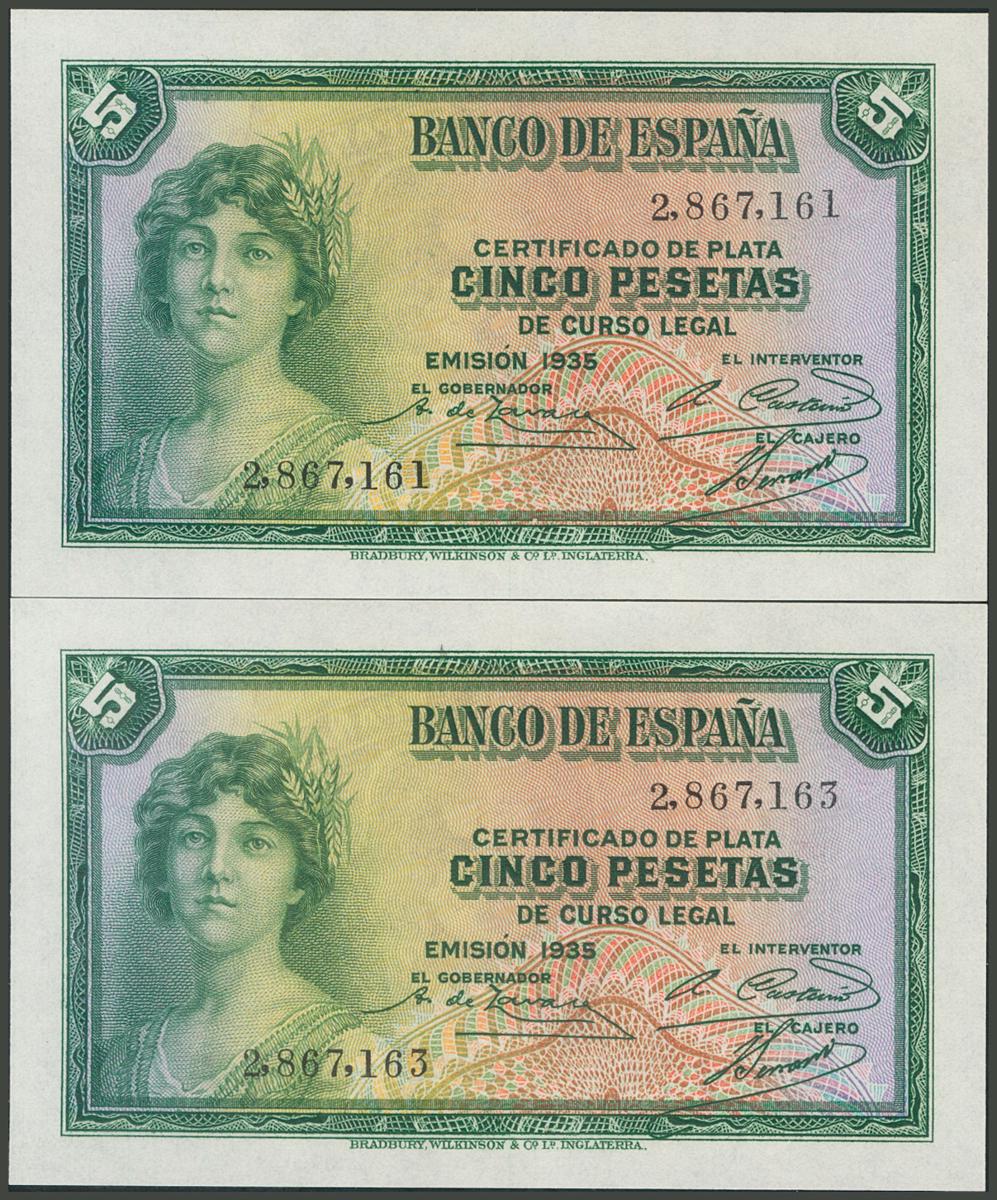 5 Pesetas. 1935. Silver Certificate. Almost correlative pair. No serie. (Edifil 2017: 363). Original sizing. Uncirculated.