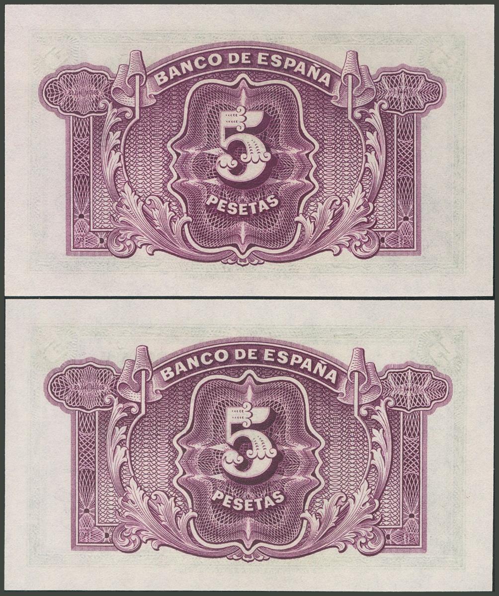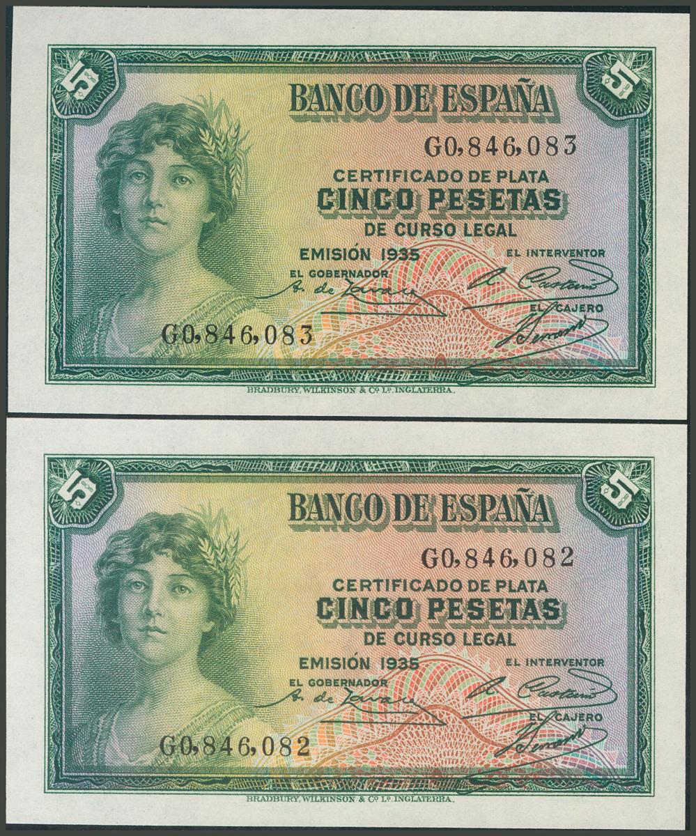 5 Pesetas. 1935. Silver Certificate. Correlative pair. Series G. (Edifil 2017: 363a, series G not listed). Original sizing. Uncirculated.