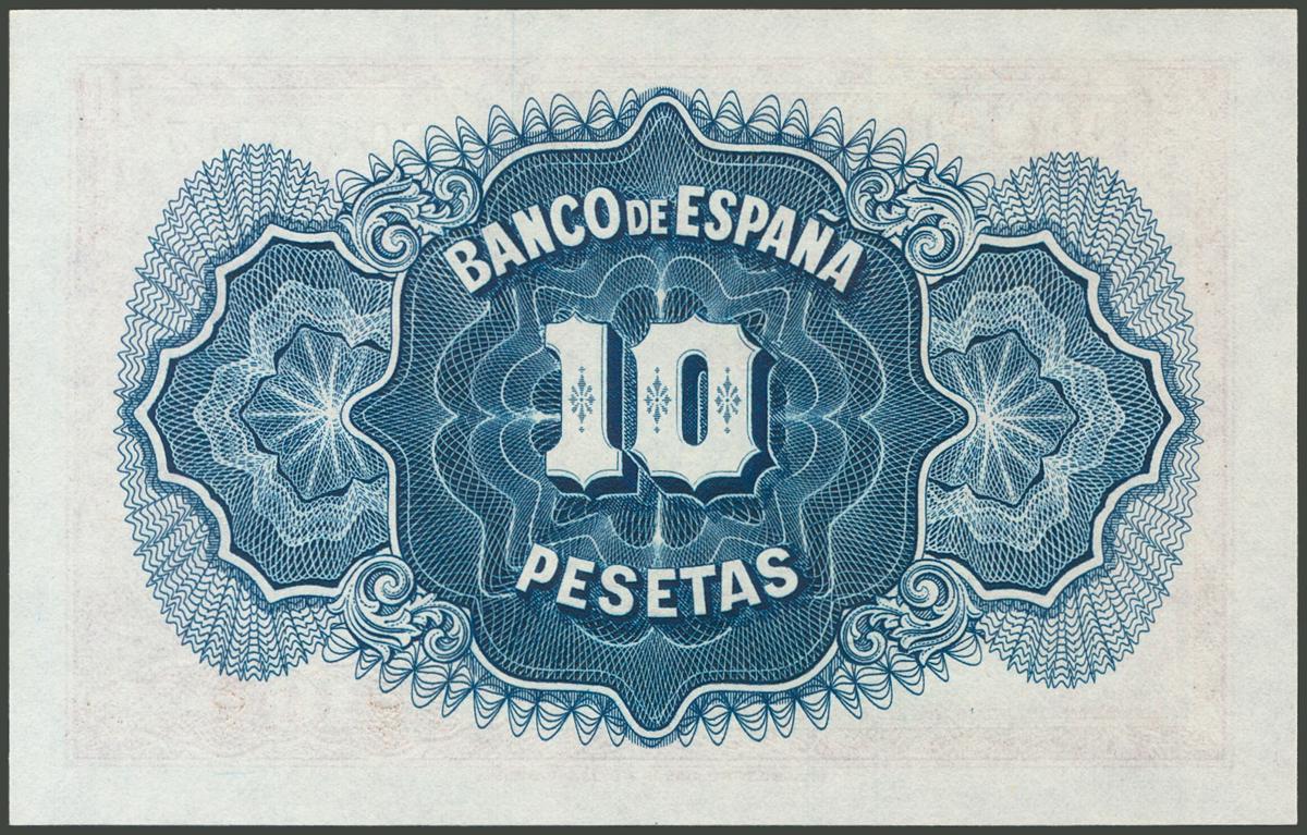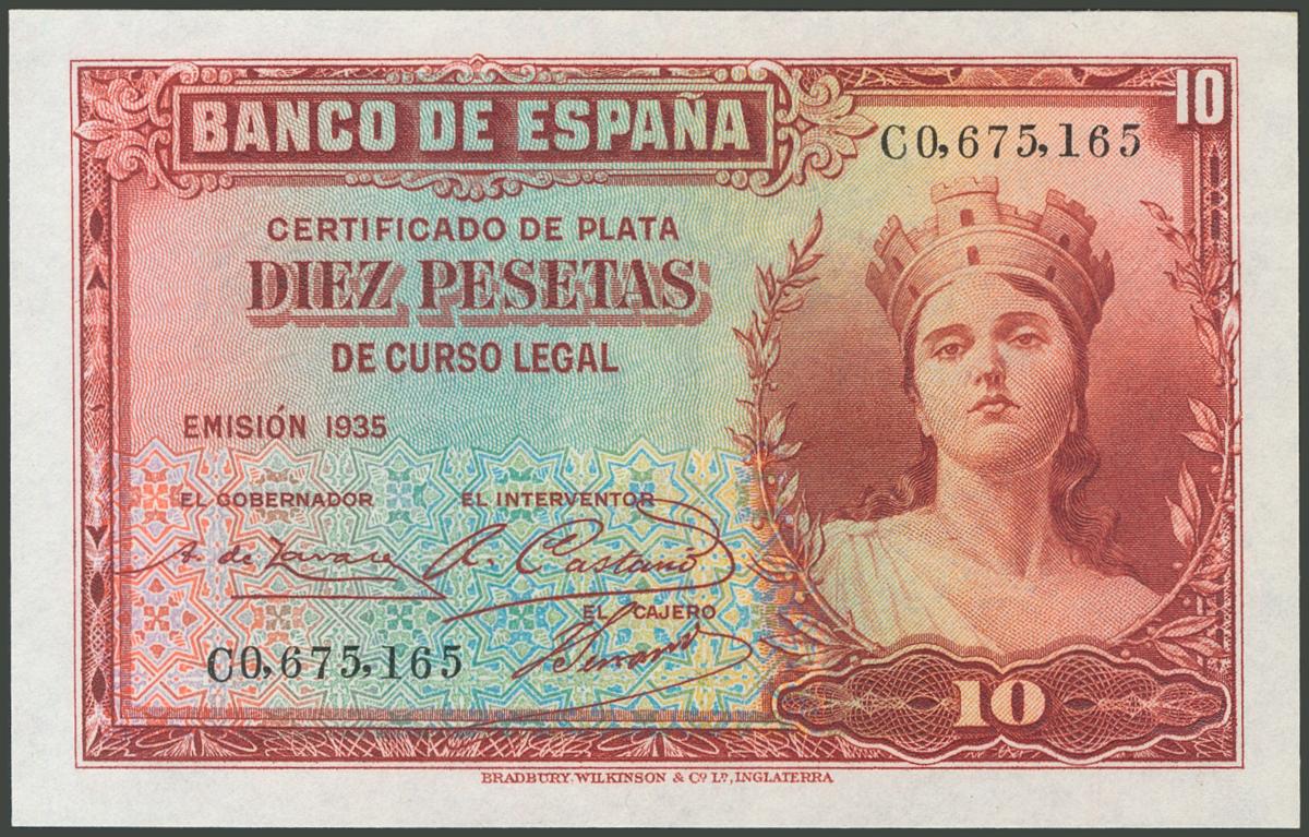 10 Pesetas. 1935. Silver Certificate. Series C, last series issued. (Edifil 2017: 364). Original sizing. Uncirculated.