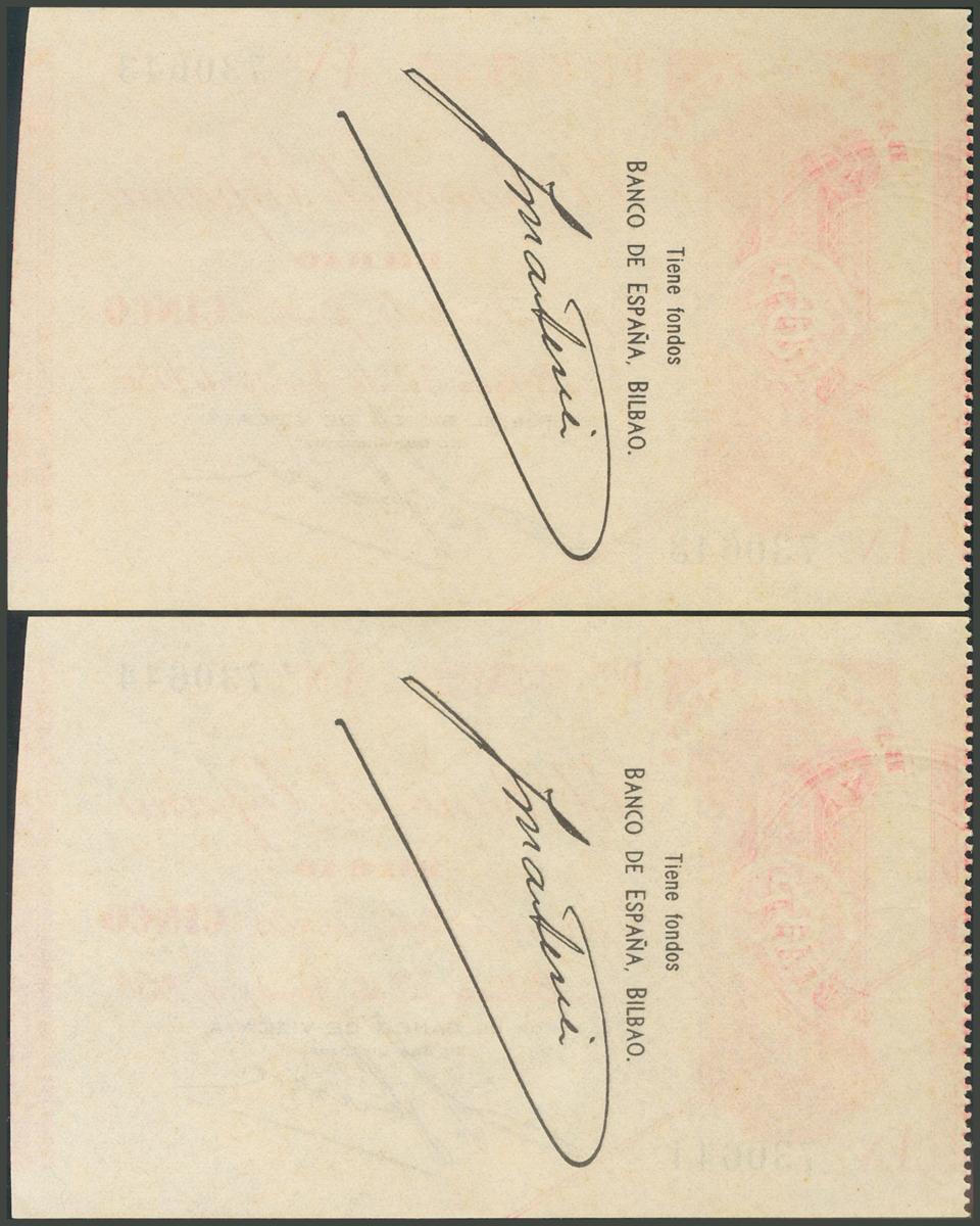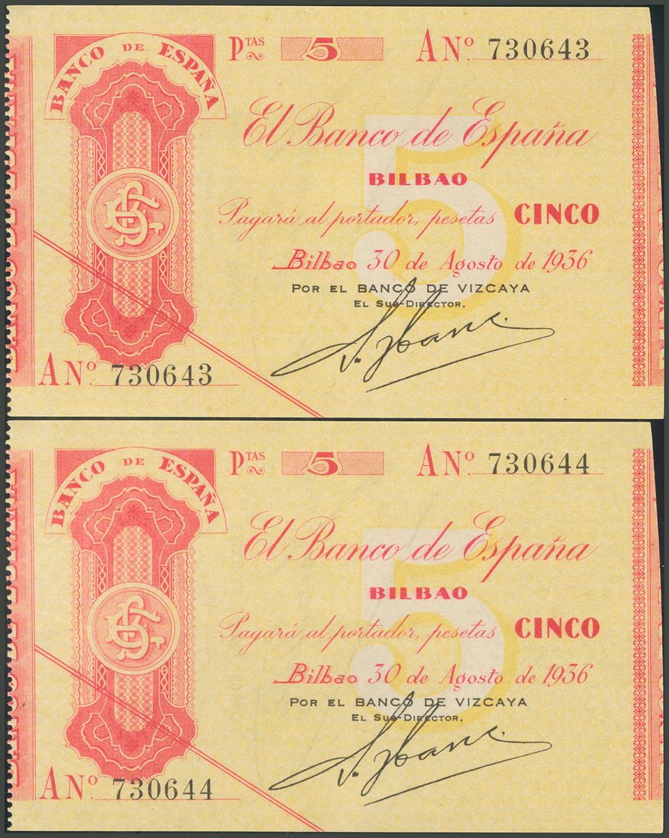 5 Pesetas. August 30, 1936. Correlative couple. Bilbao branch, forerunner of Banco de Vizcaya. Series A. (Edifil 2017: 368Aa). Good Extremely Fine.