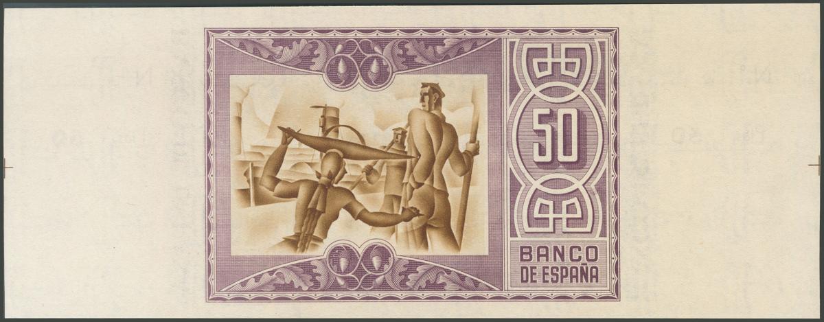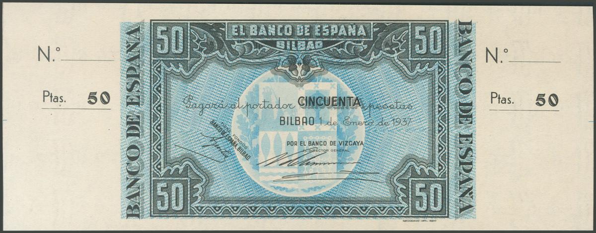 50 Pesetas. January 1, 1937. Bilbao branch, signed by Banco de Vizcaya. Without series and without numbering, with both matrices. (Edifil 2017: 389b). Almost Uncirculated.