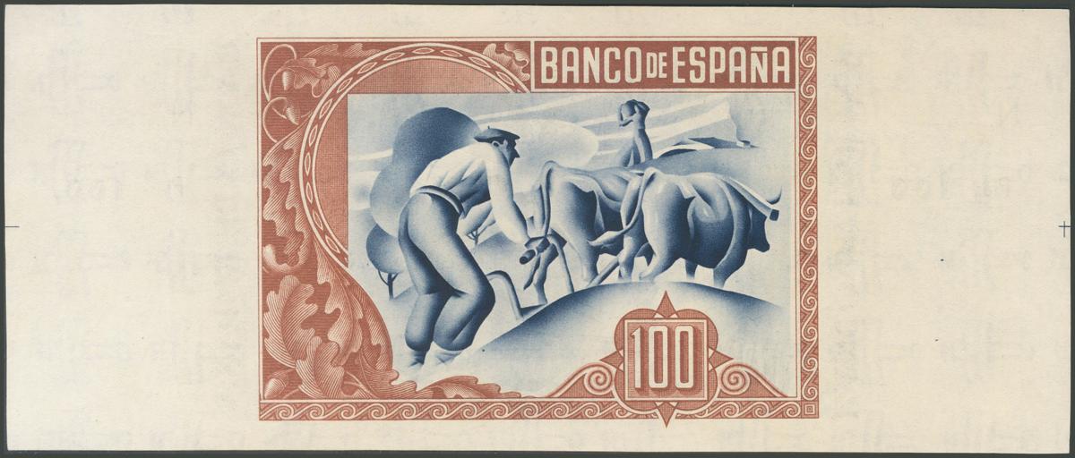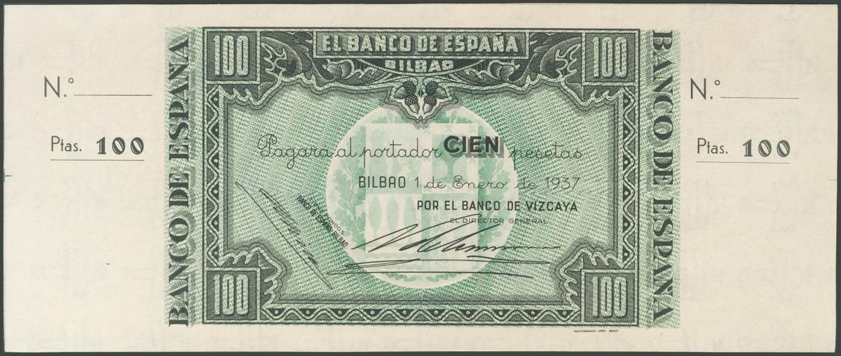 English 100 pesetas. January 1, 1937. Bilbao branch, signed by Banco de Vizcaya. Without series and without numbering, with both matrices. (Edifil 2017: 390b). Natural wrinkle of the paper. Almost Uncirculated.