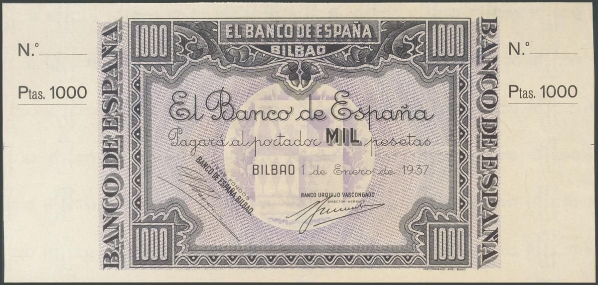 English 1000 Pesetas. January 1, 1937. Ticket not issued. Bilbao branch, signed by Banco Urquijo Vascongado. Without series and without numbering, with both matrices. (Edifil 2017: NE27f). Uncirculated.