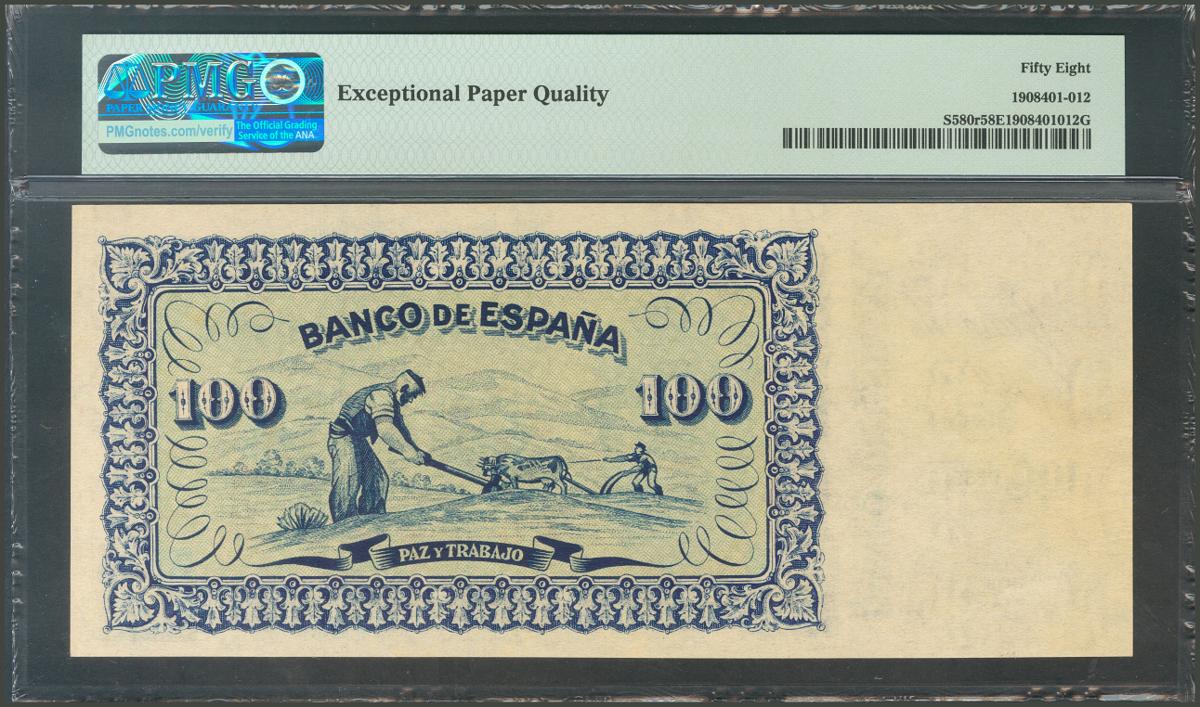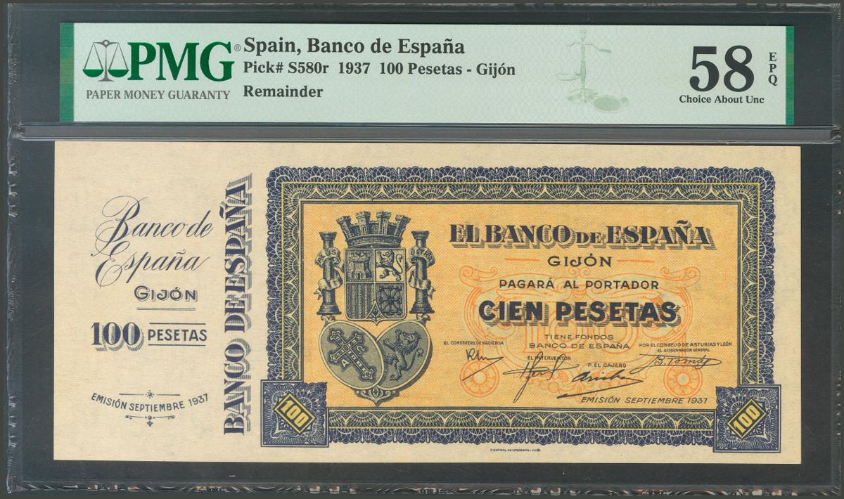 100 pesetas. September 1937. Bank of Spain, Gijón branch. Without numbering and with matrices. (Edifil 2017: 399a). Original sizing. Good Extremely Fine. Package PMG58EPQ.
