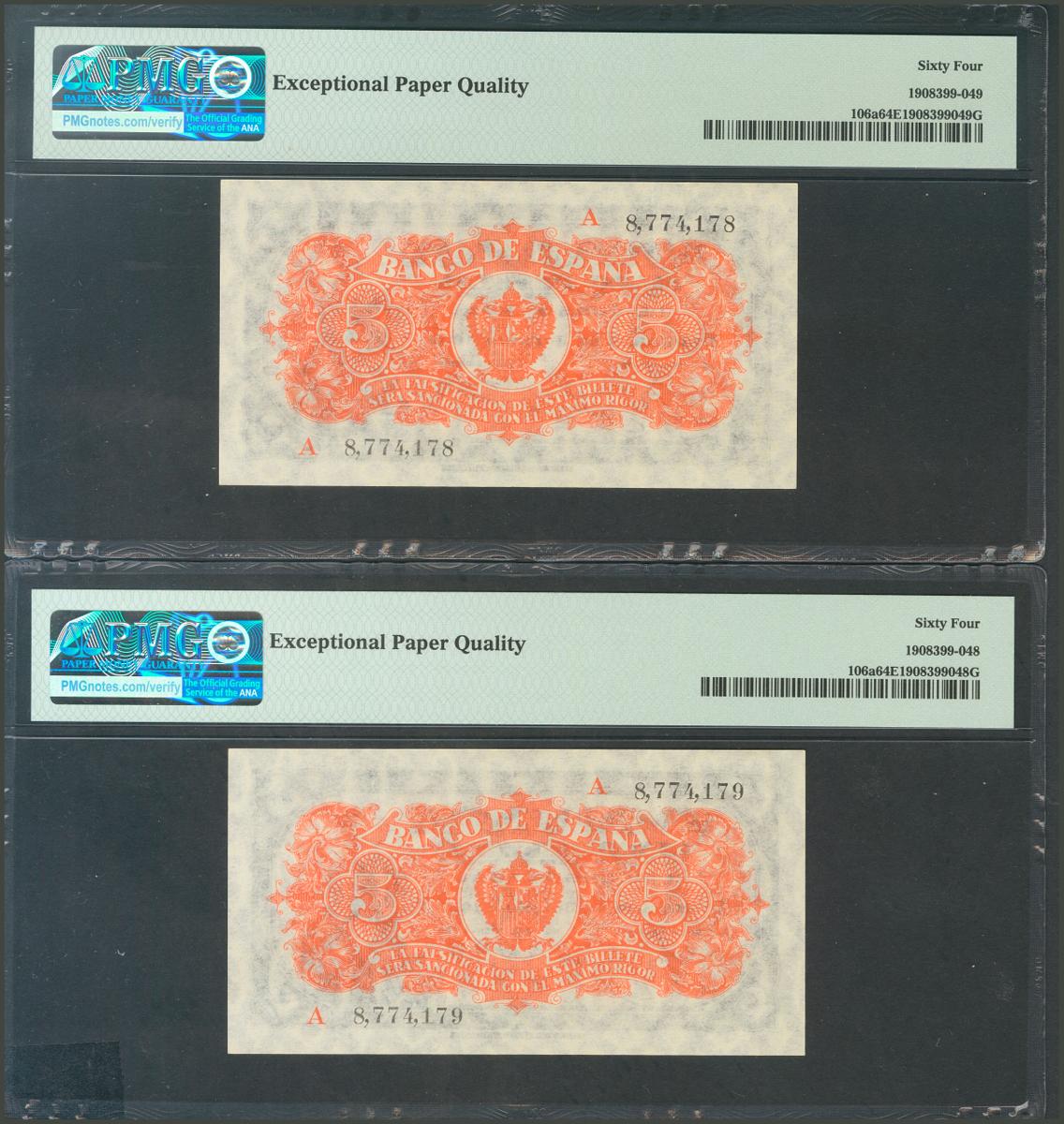 5 Pesetas. July 18, 1937. Correlative couple. Series A. (Edifil 2017: 424a). Original sizing. Uncirculated. PMG64EPQ packages, both.