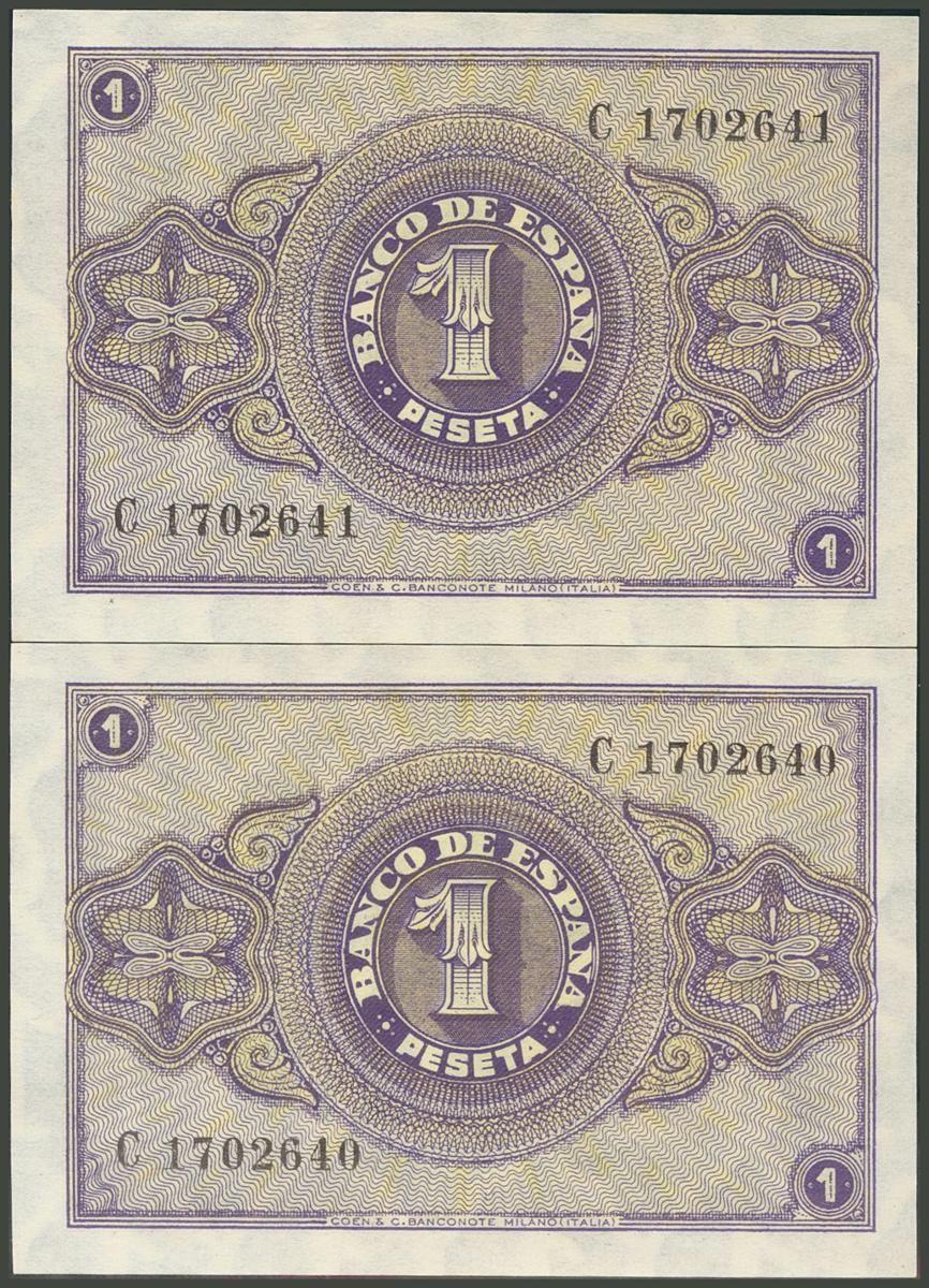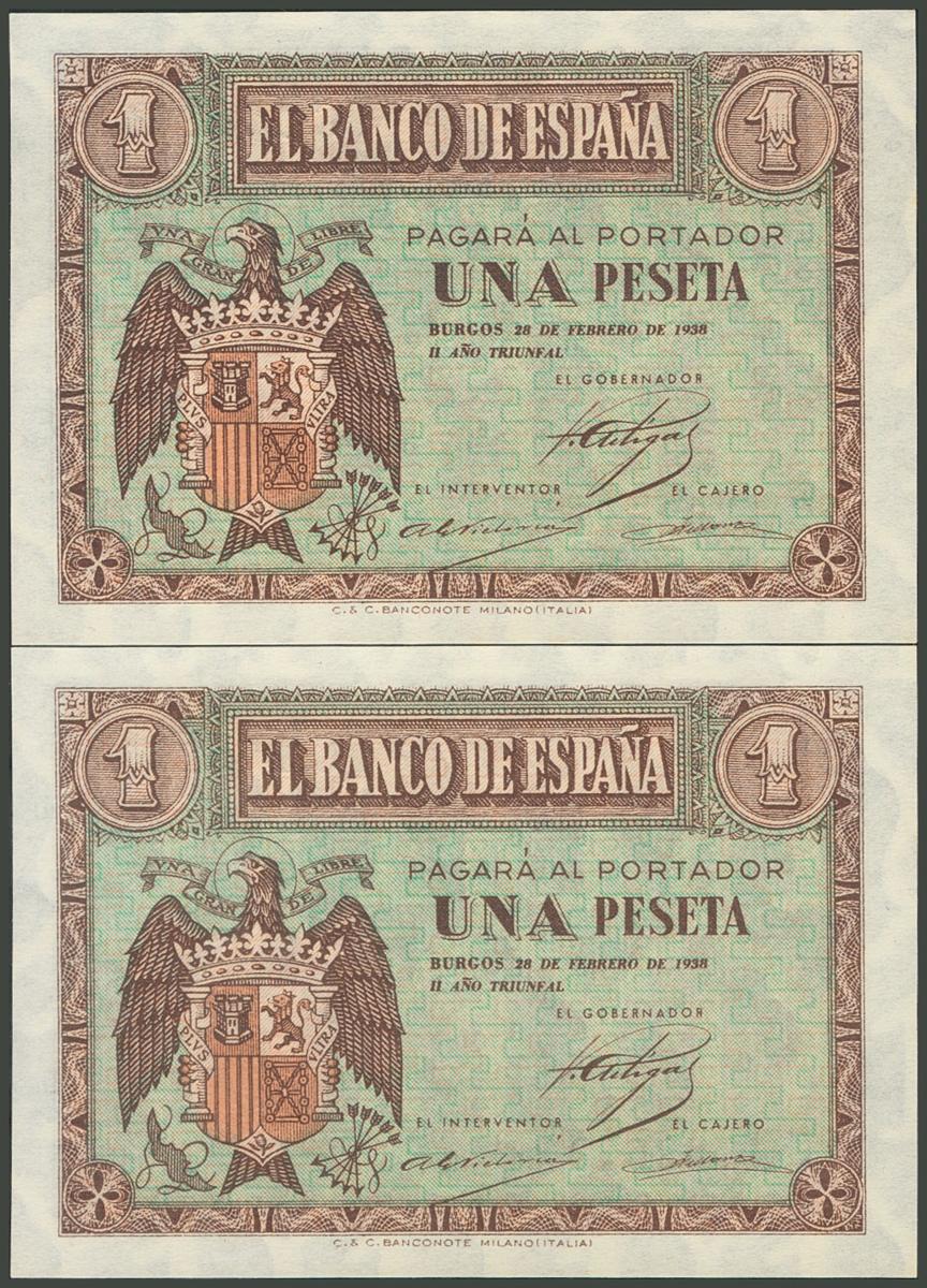 English 1 peseta. February 28, 1938. Correlative pair. Series C. (Edifil 2017: 427a). Original sizing. Uncirculated.