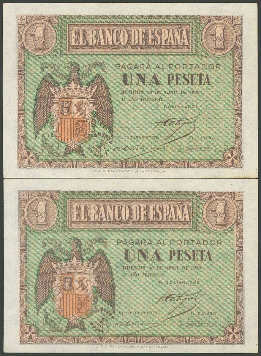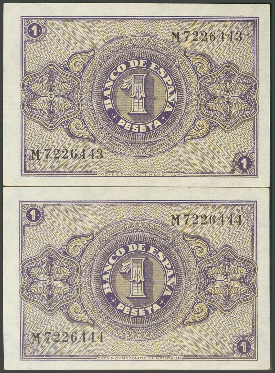 1 peseta. April 30, 1938. Correlative pair. Series M. (Edifil 2017: 428a). Original sizing. Almost Uncirculated.
