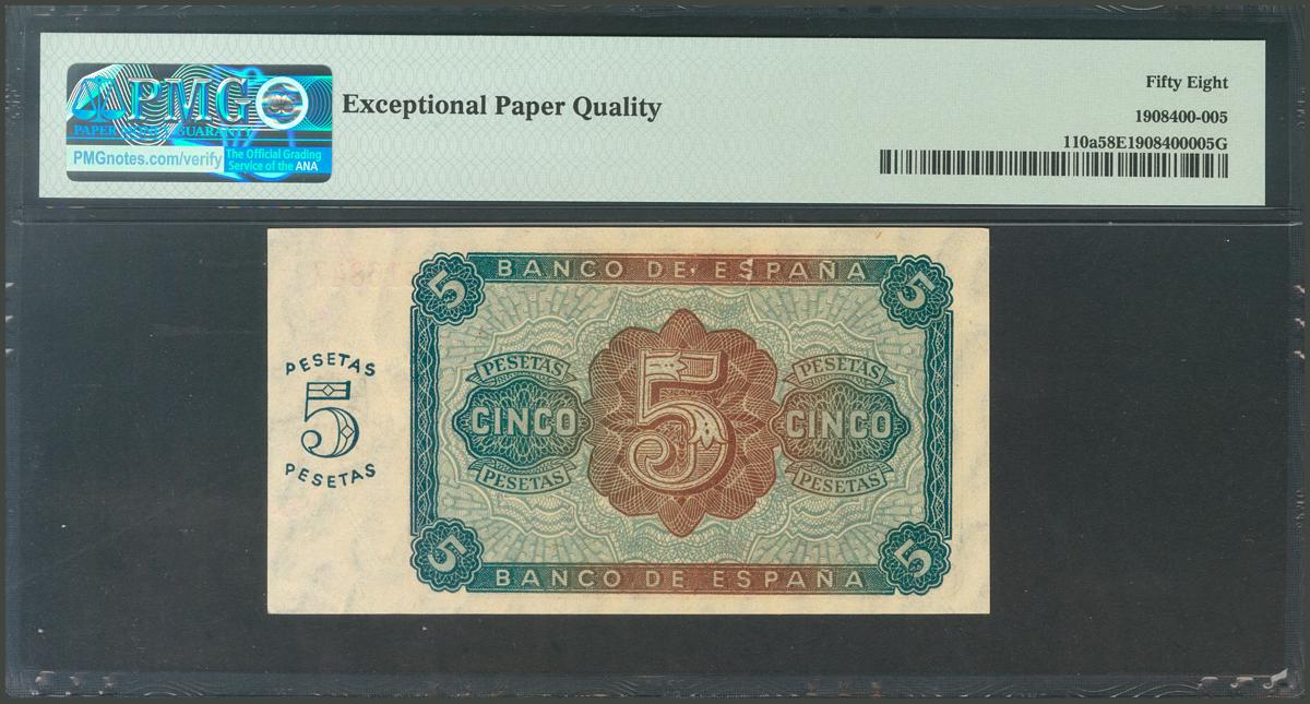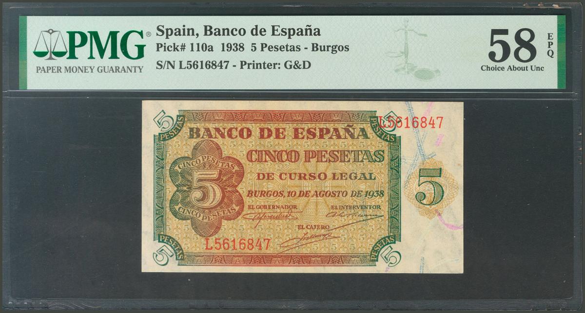 English 5 Pesetas. August 10, 1938. Series L. (Edifil 2017: 435a). Original sizing. Good Extremely Fine. Package PMG58EPQ.