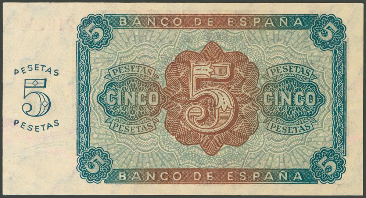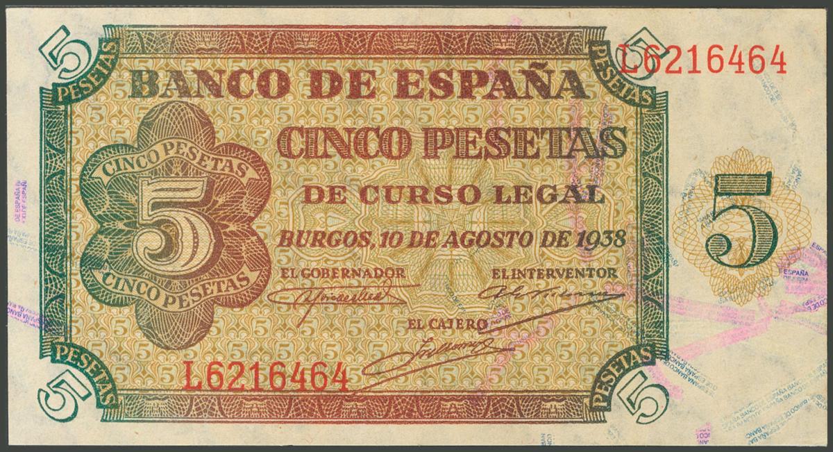 5 Pesetas. August 10, 1938. Series L. (Edifil 2017: 435a). Presents much of the original sizing. Good Extremely Fine.