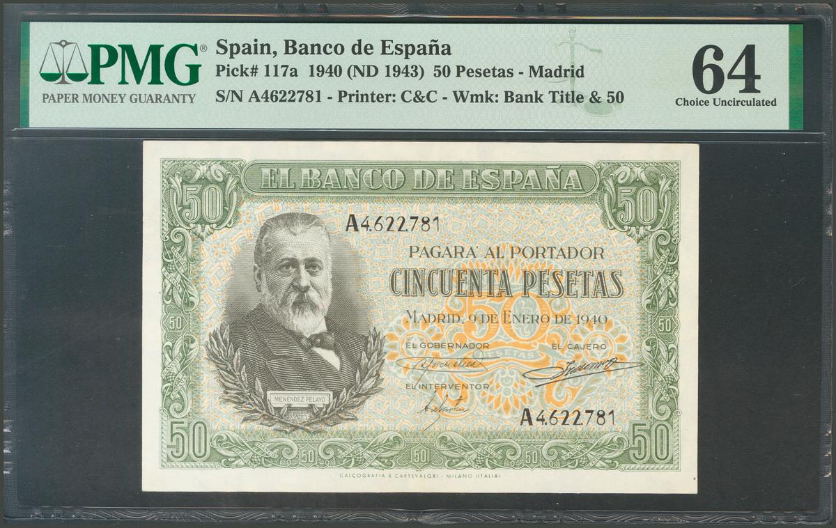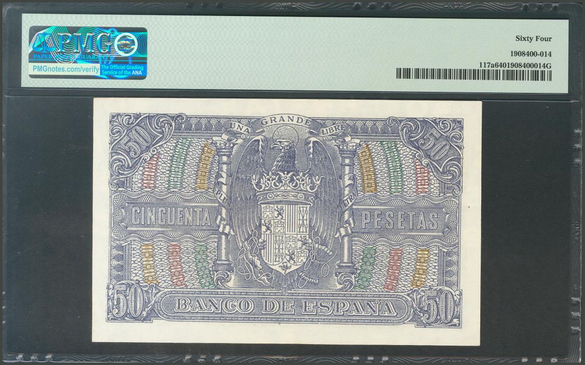 50 Pesetas. January 1, 1940. Series A. (Edifil 2017: 437). Uncirculated. PMG64 package.