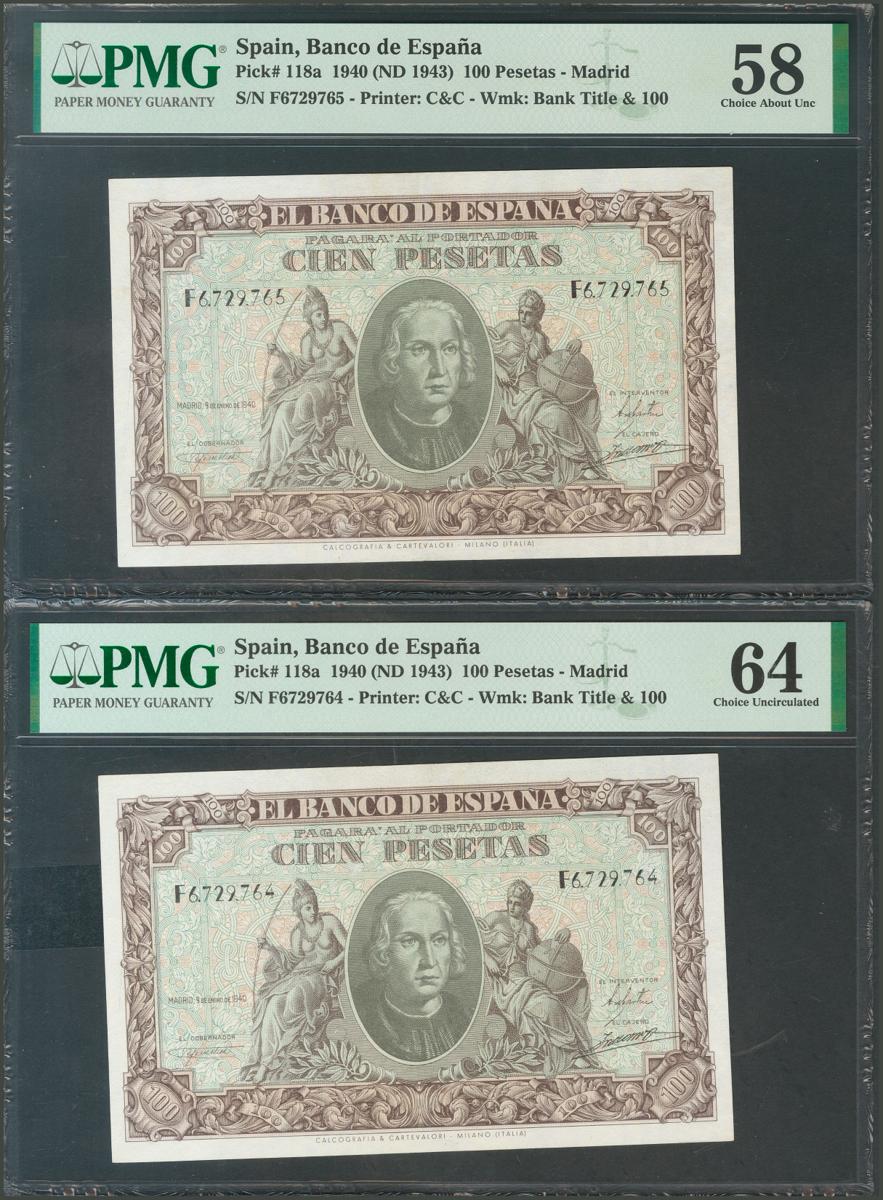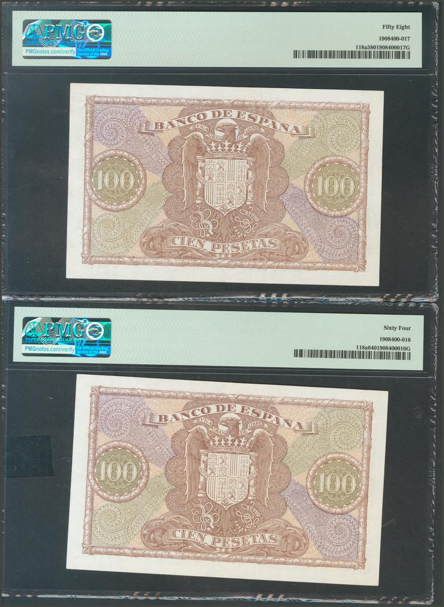 100 pesetas. January 9, 1940. Correlative pair. Series F. (Edifil 2017: 438a). Uncirculated/ Good Extremely Fine. Encapsulated PMG64 / 58.