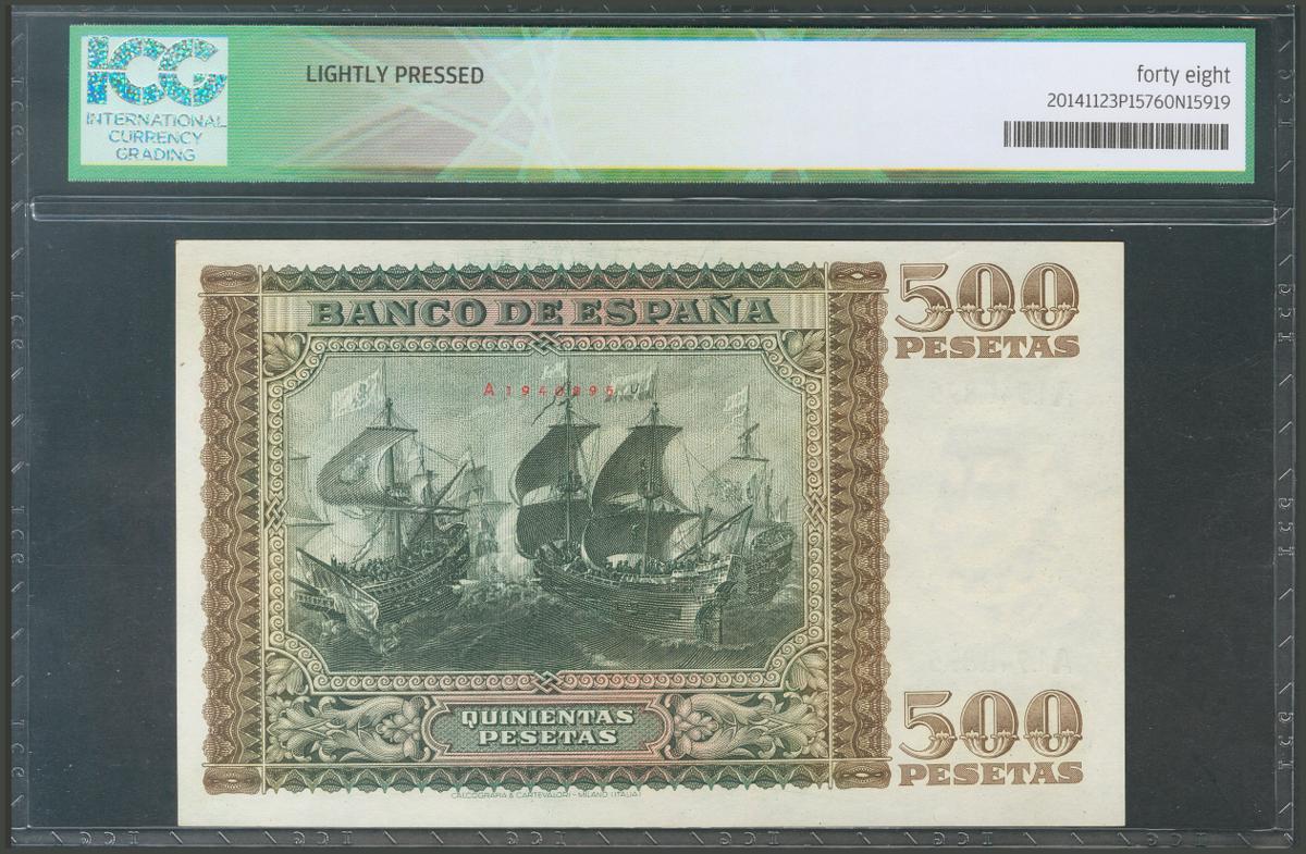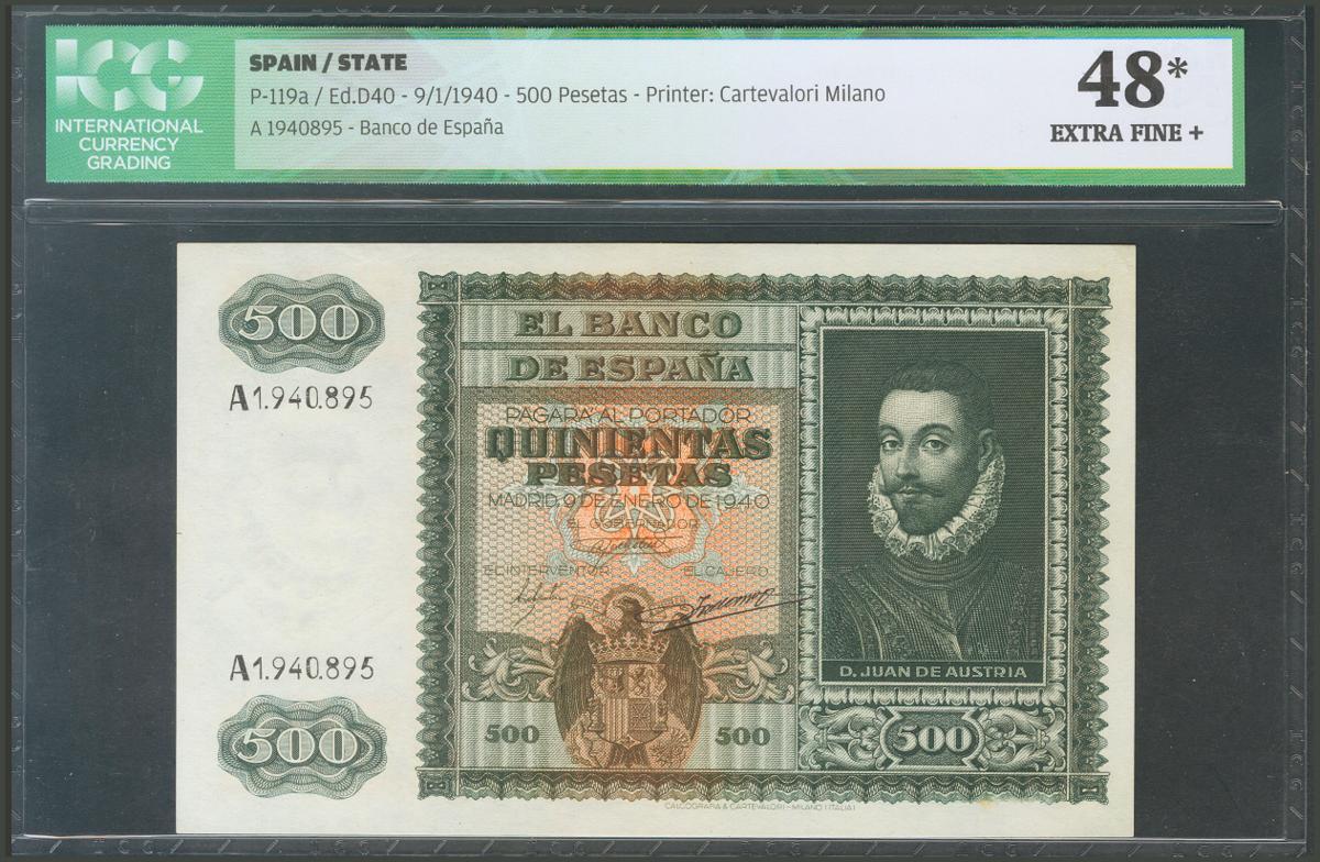 500 pesetas. January 9, 1940. Series A. (Edifil 2017: 439). Almost Extremely Fine. Package ICG48 *.