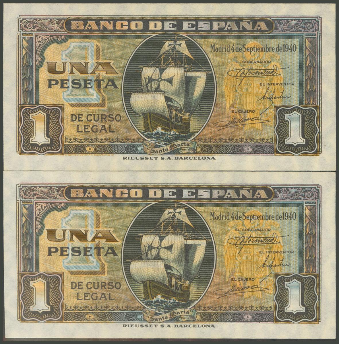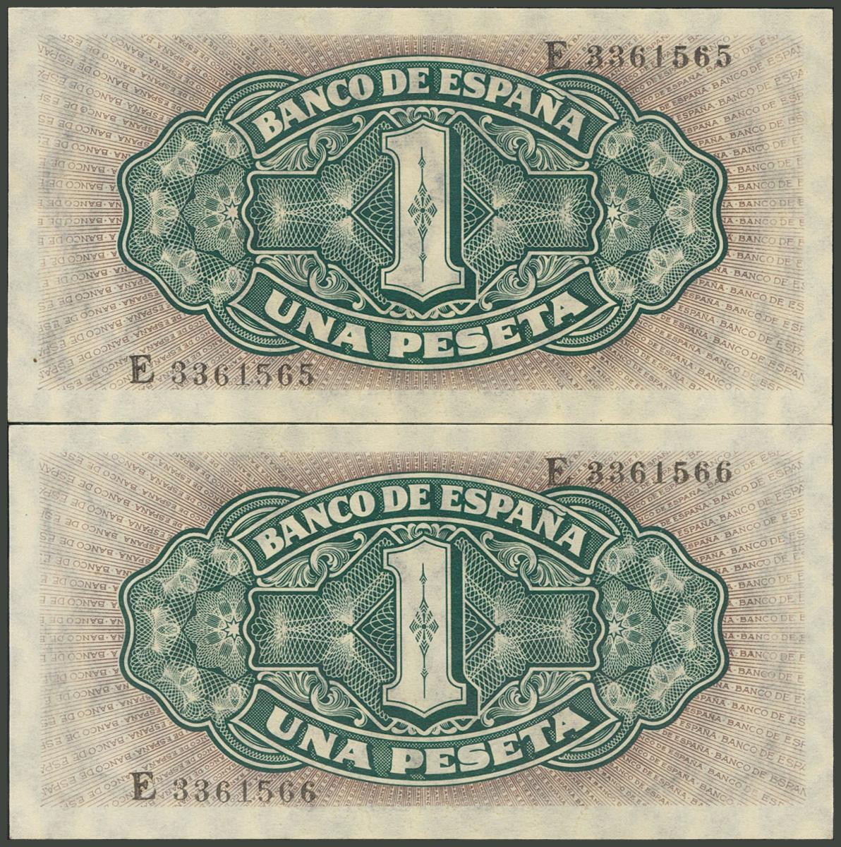 1 peseta. September 4, 1940. Correlative pair. Series E. (Edifil 2017: 442a). Retains part of the original size. Uncirculated.
