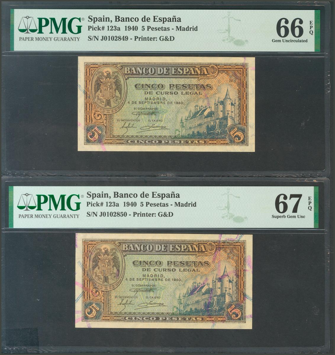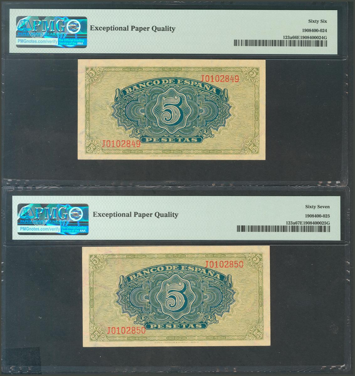5 Pesetas. September 4, 1940. Correlative pair. Series J. (Edifil 2017: 443a). Original sizing. Uncirculated. PMG67EPQ / 66EPQ package.