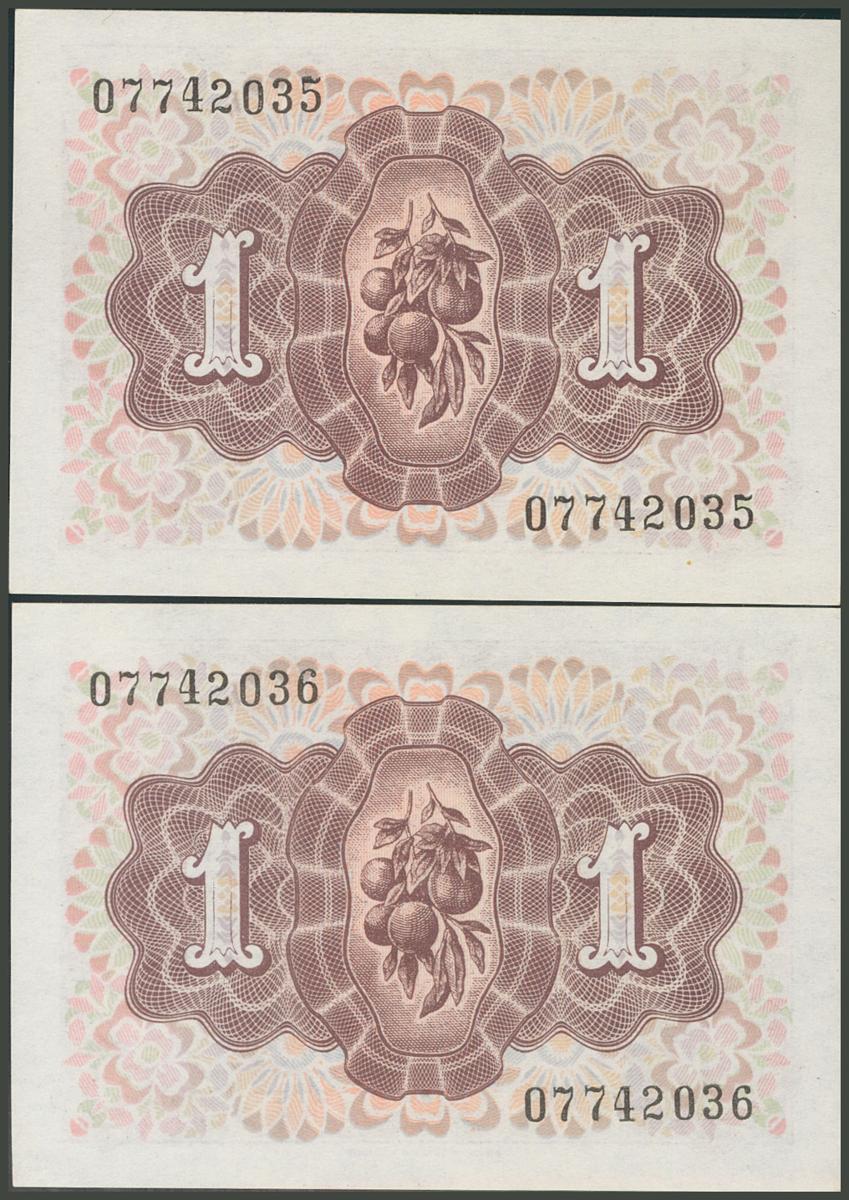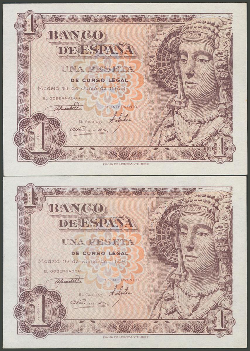 1 peseta. June 19, 1948. Correlative couple. No serie. (Edifil 2017: 457). Original sizing. Uncirculated.