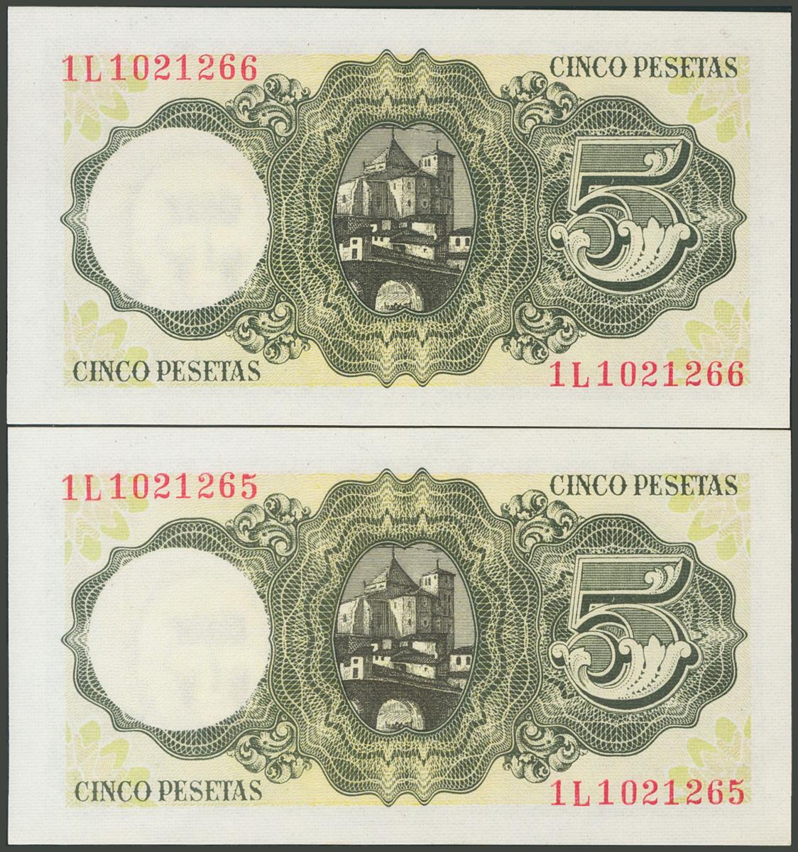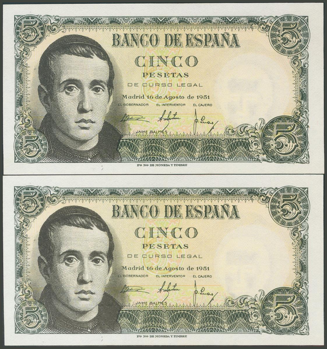 5 Pesetas. August 16, 1951. Correlative couple. Series 1L, last series issued. (Edifil 2017: 459a). Original sizing. Uncirculated.