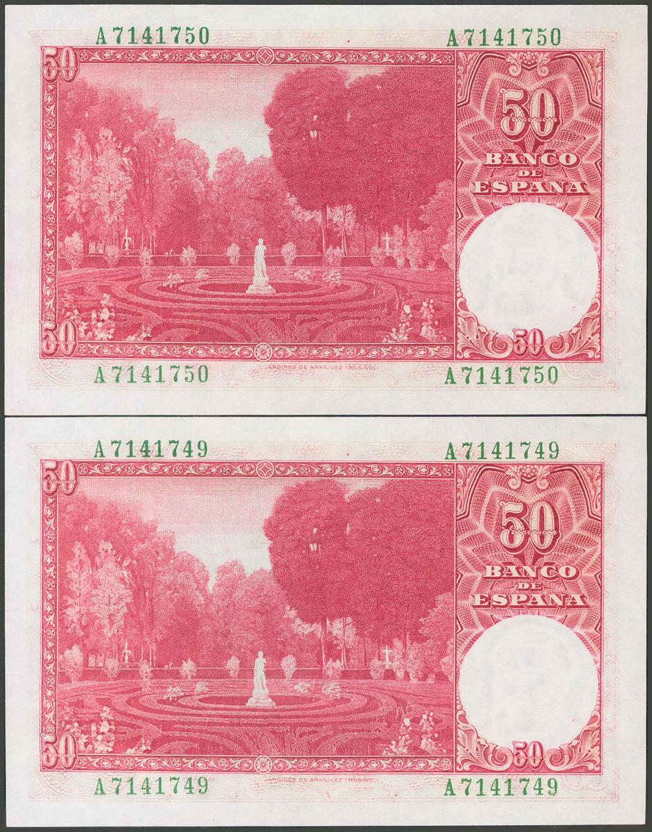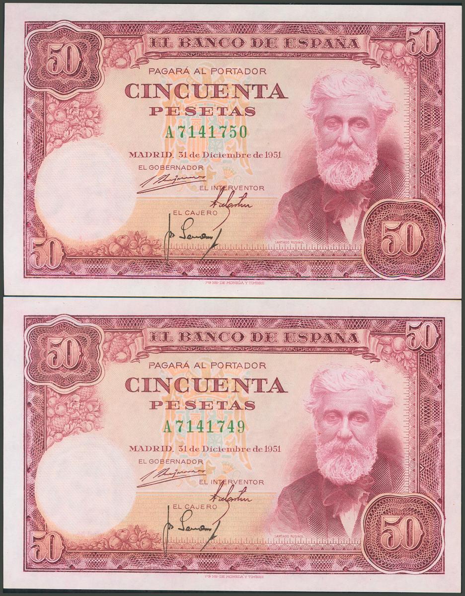 English 50 Pesetas. December 31, 1951. Correlative couple. Series A. (Edifil 2017: 462a). Preserves all the original sizing. Good Extremely Fine.