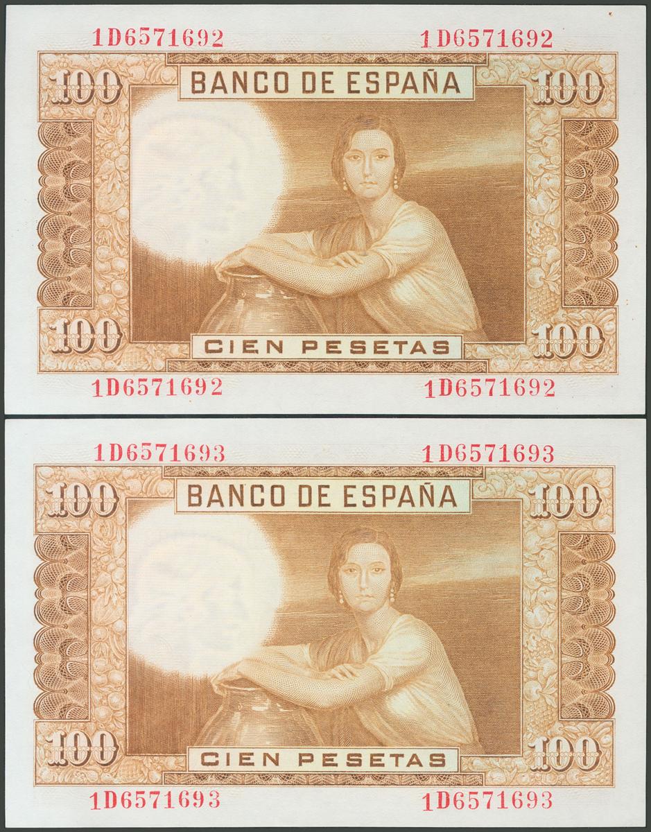 100 pesetas. April 7, 1953. Correlative couple. Series 1D. (Edifil 2017: 464c). Original sizing. Uncirculated.