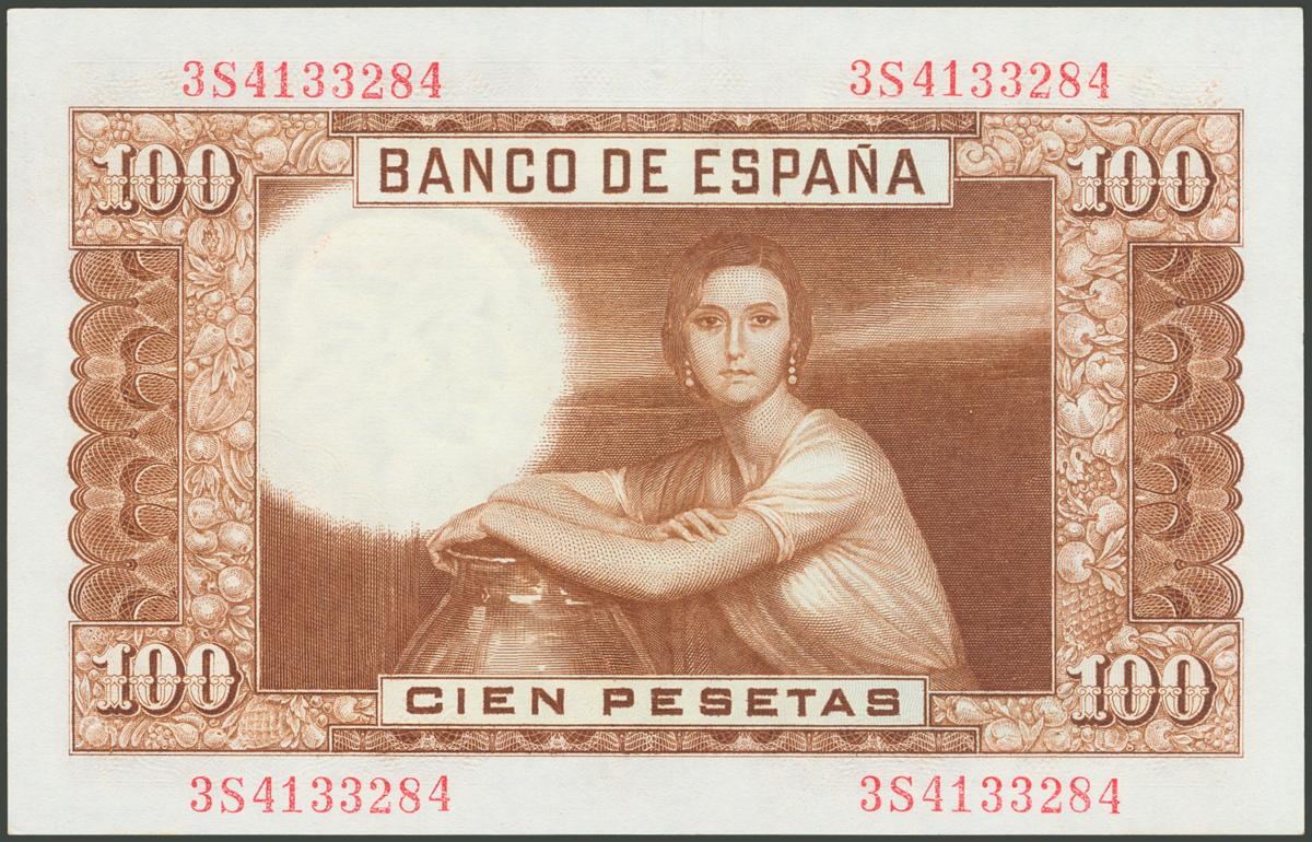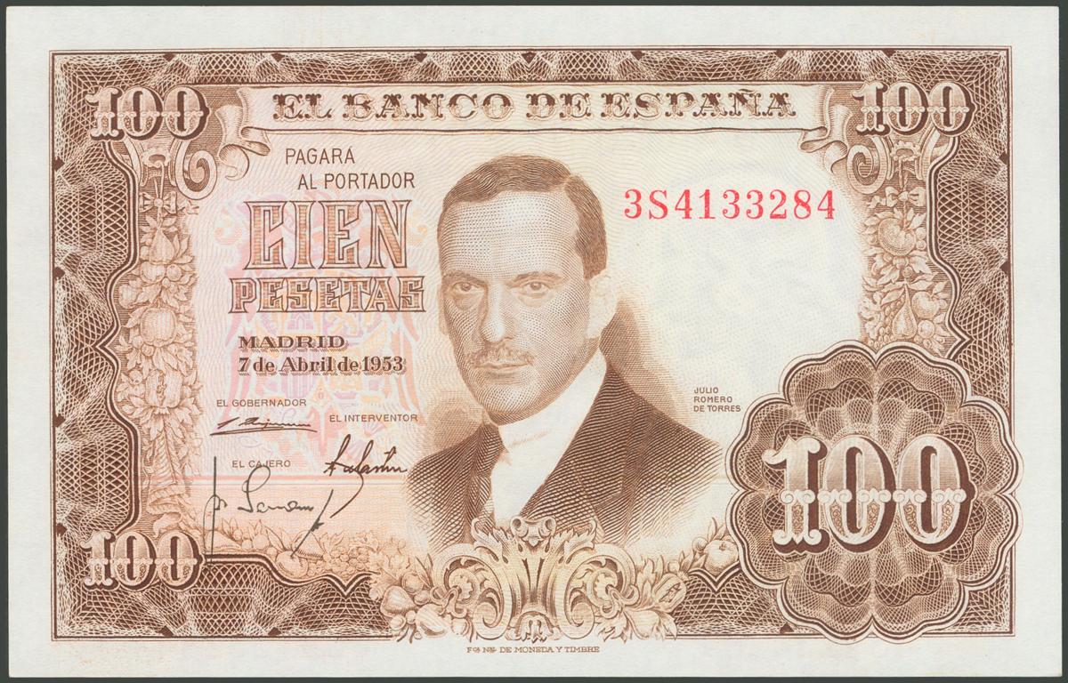 100 pesetas. April 7, 1953. Series 3S. (Edifil 2017: 464c). Original sizing. Uncirculated.