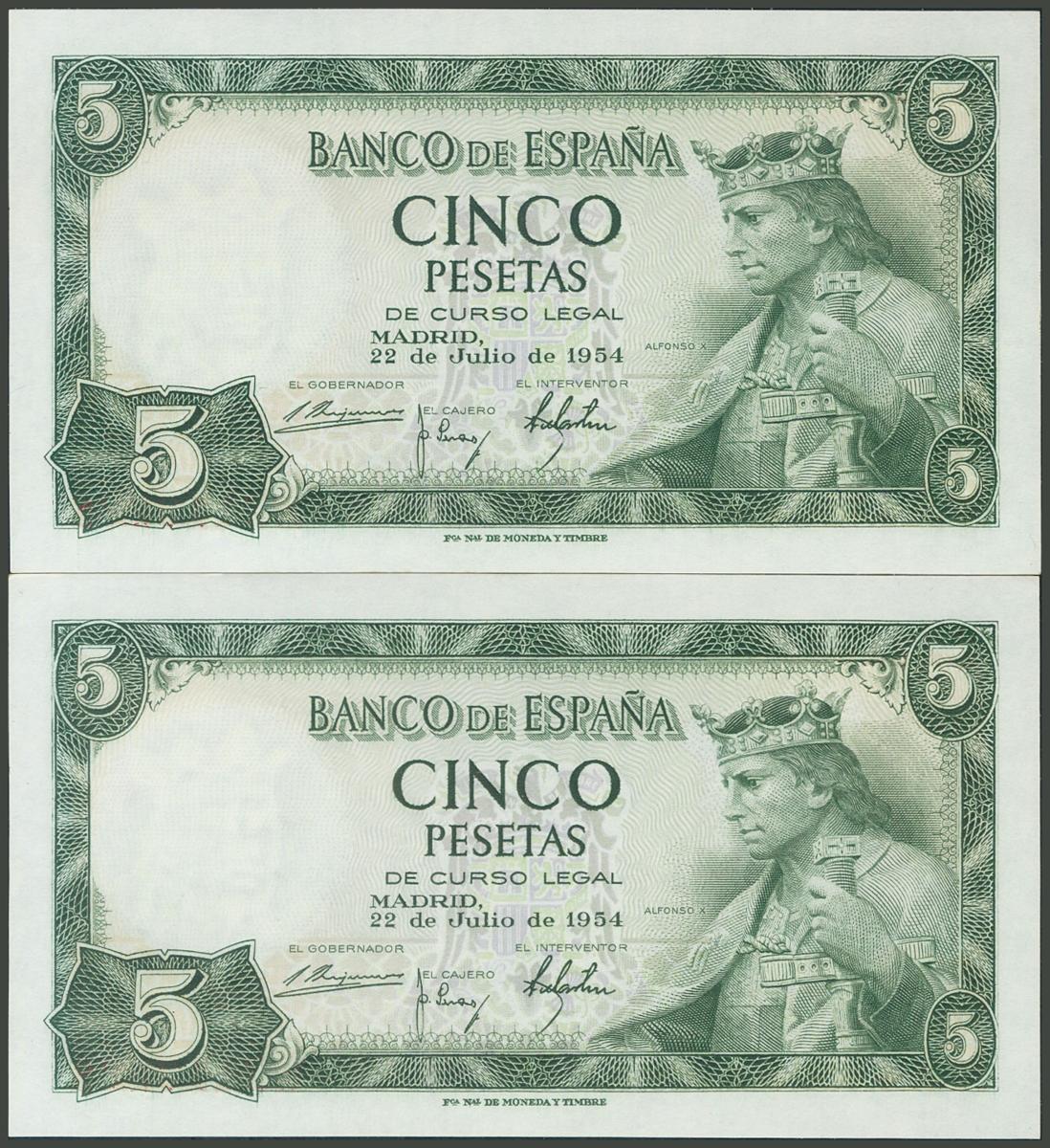5 Pesetas. July 24, 1954. Correlative couple. Series E. (Edifil 2017: 466a). Original sizing. Uncirculated.