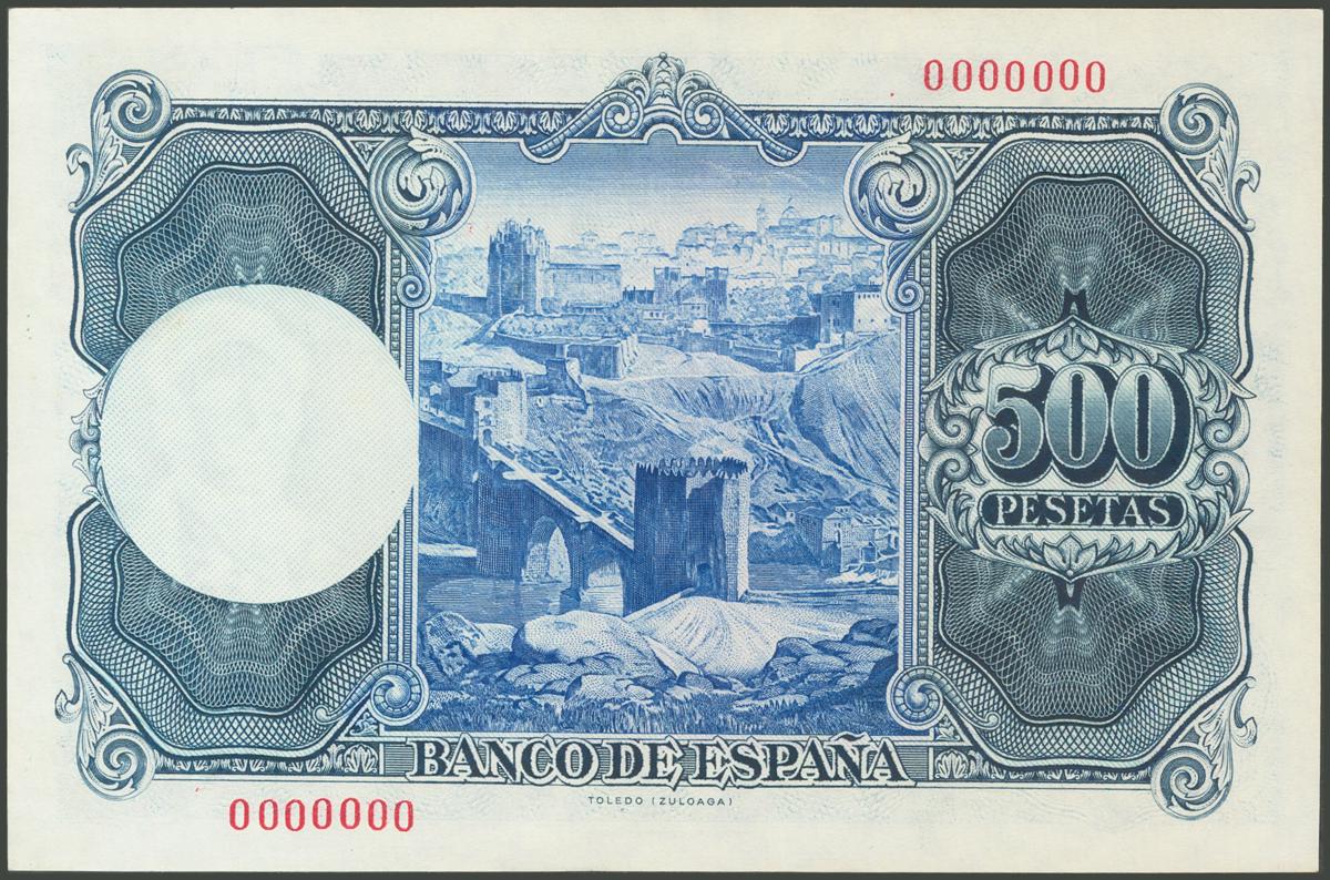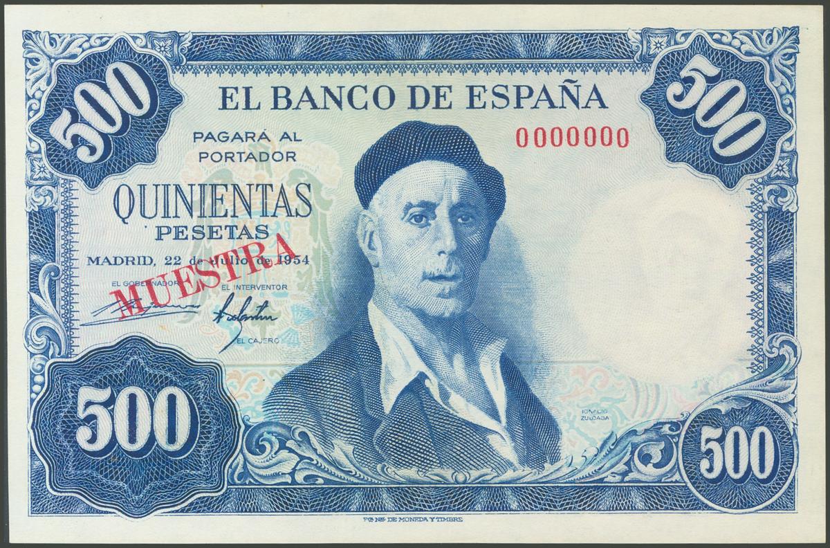 500 pesetas. July 22, 1954. SAMPLE and numbering 0000000. (Edifil 2017: 466N). Original sizing. Uncirculated.