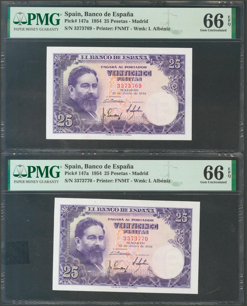 25 Pesetas. July 22, 1954. Correlative couple. No serie. (Edifil 2017: 467). It retains all its original sizing, spectacular pair. Uncirculated. PMG66EPQ package, both.