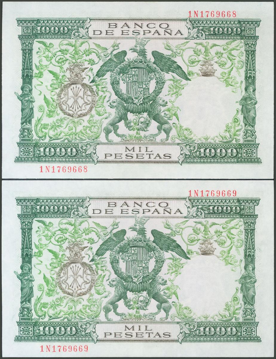 1000 Pesetas. November 29, 1957. Correlative pair. Series 1N. (Edifil 2017: 469b). It retains all its original size. Uncirculated.