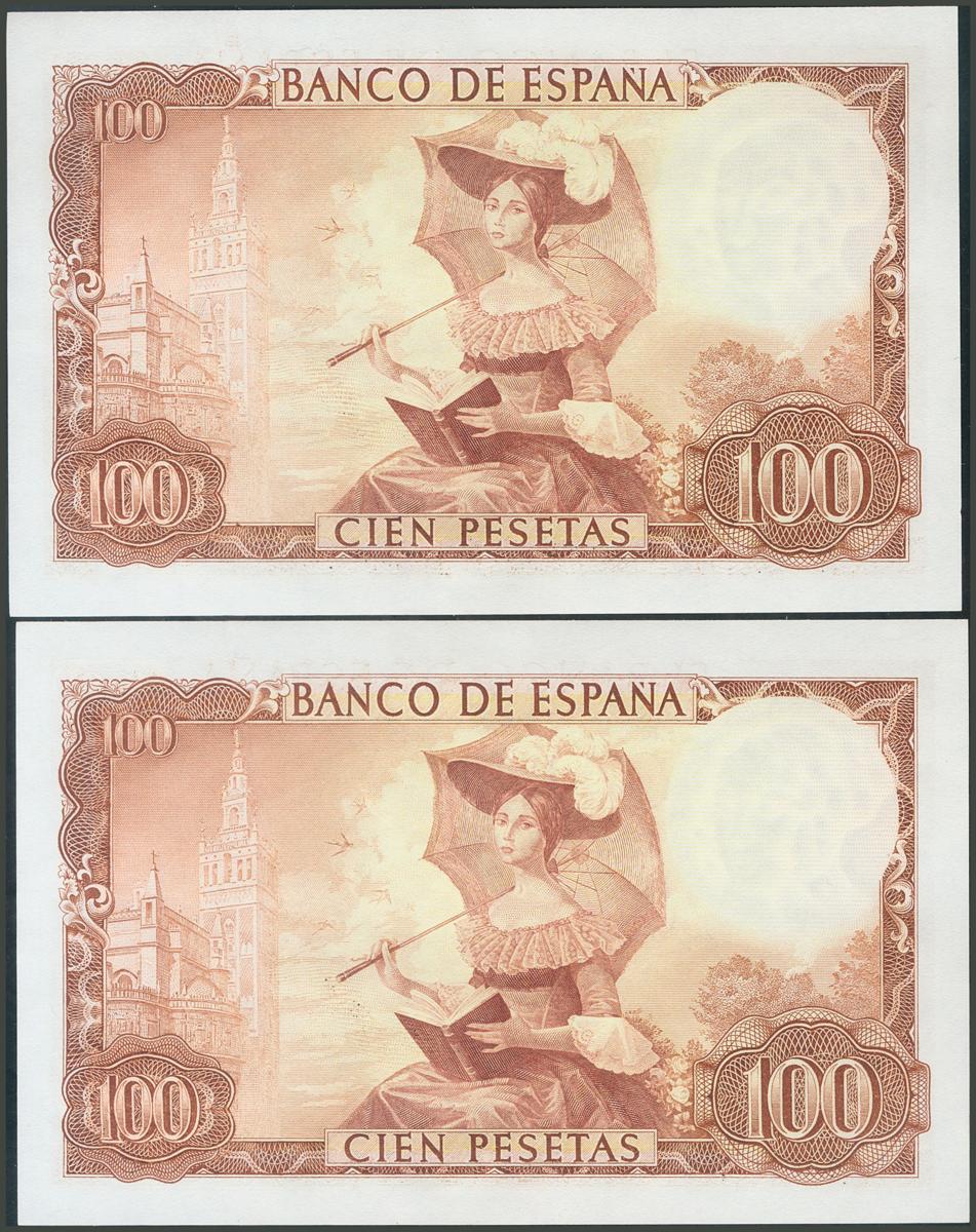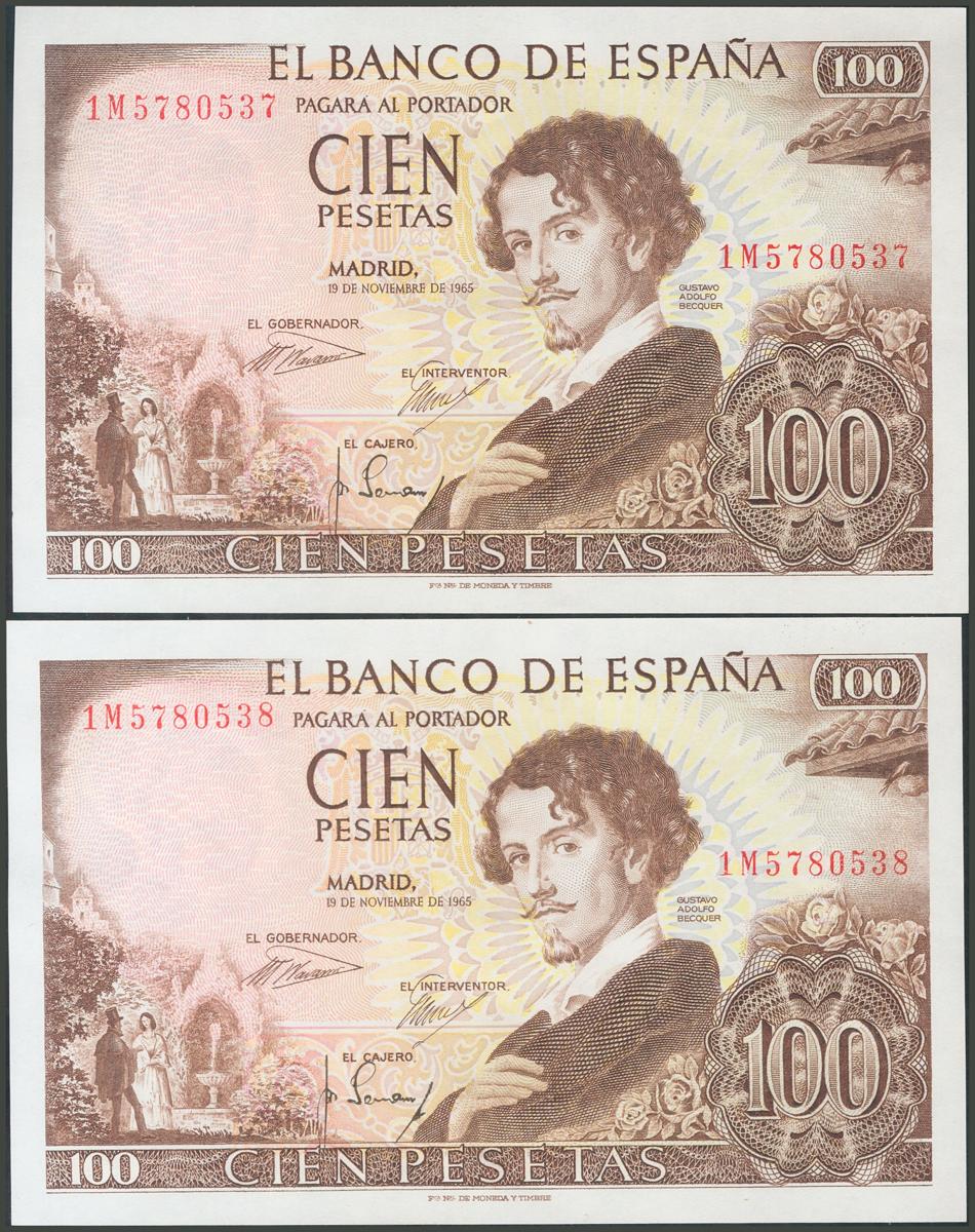English 100 pesetas. November 19, 1965. Correlative couple. Series 1M. (Edifil 2017: 470a). Original sizing. Uncirculated.