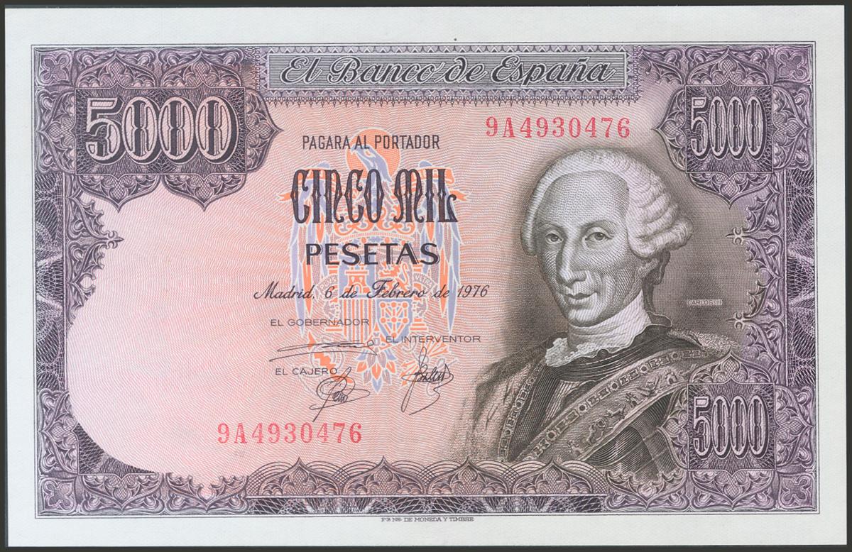 5000 pesetas. February 6, 1976. Correlative pair. 9A special series. (Edifil 2017: 475b). Original sizing. Good Extremely Fine.