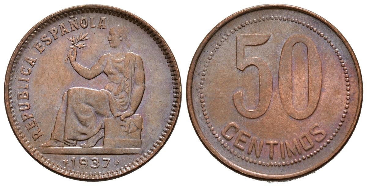 II REPUBLIC (1931-1939). 50 Cents. (Ae. 6.22g / 23mm). 1937 * 3-4. Madrid. (Cal-2019-29). Extremely Fine. Gorgeous shade.