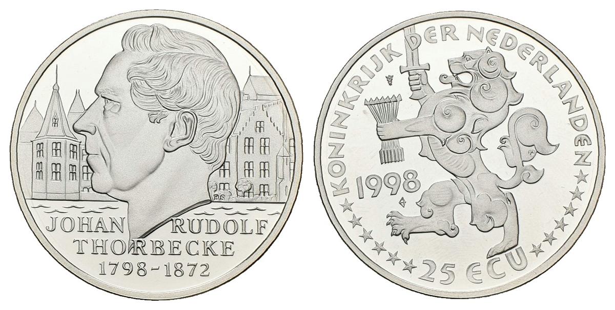 NETHERLANDS. 25 Ecu (Ar. 24.88g / 38mm). 1998. Johan Rudolf Thorbecke. PROOF. Mintage of 25,000 units. Includes box and certificate of authenticity.