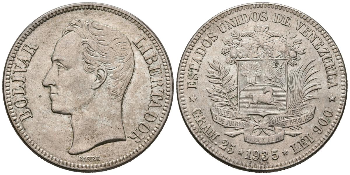 English UNITED STATES OF VENEZUELA. 5 Bolivars. (Ar. 25.00g / 37mm). 1935. Philadelphia. (Km # Y24.2). Almost Uncirculated.