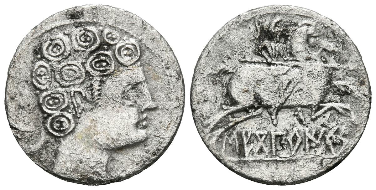 SECOBIRICES (Saelices, Cuenca). Denarius. (Ar. 3.00g / 19mm). 120-30 BC (FAB-2169). Anv: Male head to the right, crescent behind and a point. Rev: Rider with lance to the right, below Iberian legend on line: SECoBiRICeS. Very Fine. Cleaned.
