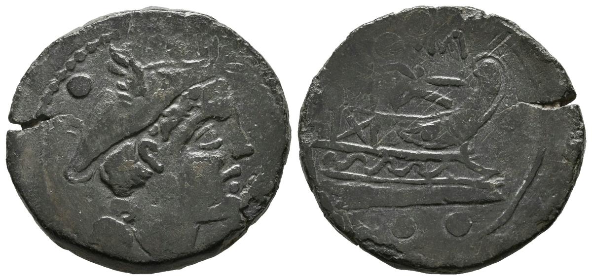 ANONYMOUS. Sextant. (Ae. 6.77g / 23mm). 211 BC Rome. (Crawford 56/6). Anv: Head of Mercury with helmet on the right, two points above. Rev: Bow to the right, above Victoria flying to the right, above legend: ROMA, below two points. Almost Very Fine.