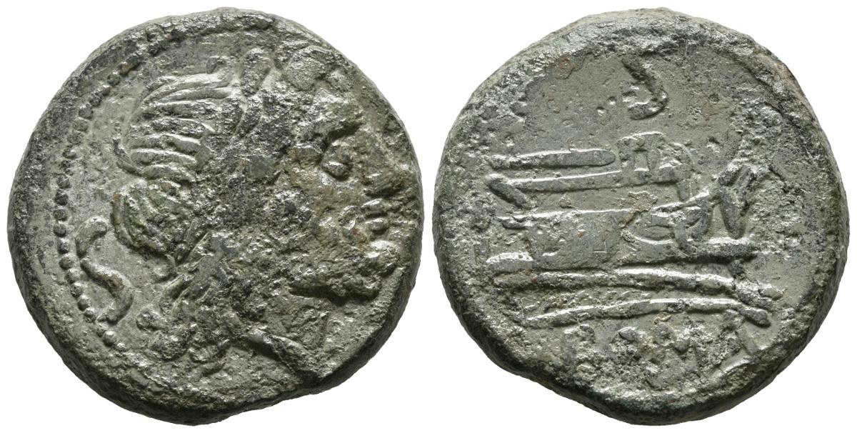 ANONYMOUS. Semis. (Ae. 21.93g / 29mm). 215-212 BC Rome. (Crawford 41 / 6e). Anv: Head of Saturn laureate to the right, behind S. Rev: Bow to the right, above S, below legend: ROMA. Very Fine.