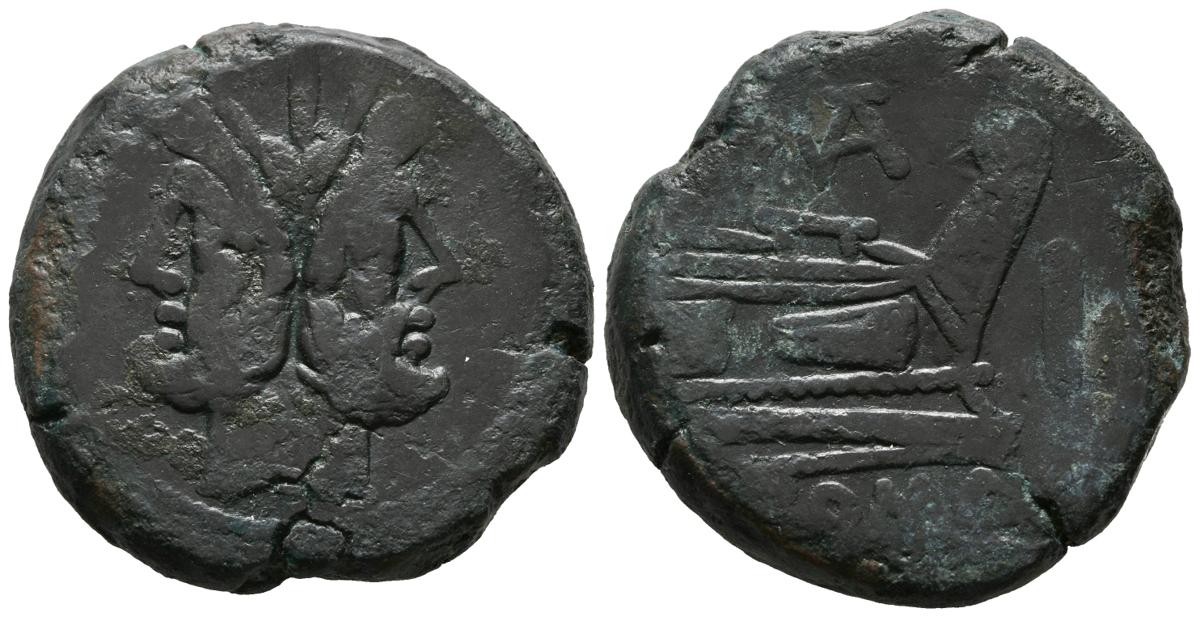 GENS MATIENA. As. (Ae. 27.63g / 26mm). 179-170 BC Rome. (Crawford 162/3). Anv: Head of Janus bifronte, above I. Rev: Bow to the right, above legend: MAT, below: ROMA, in front I. Almost Very Fine.