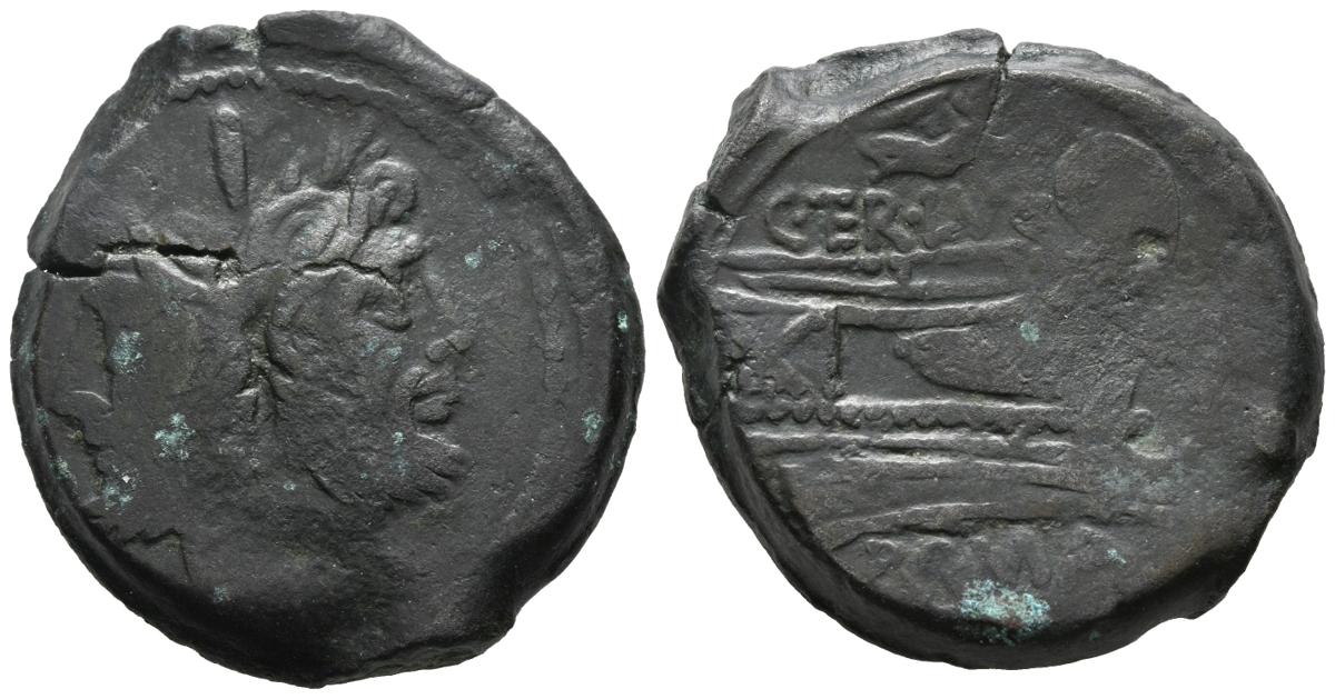 GENS TERENTIA. As. (Ae. 22.54g / 32mm). 147 BC Rome. (Crawford 217/2). Anv: Head of Janus double-faced, above I. Rev: Bow to the right, above legend: C TER LVC, above Victoria flying to the right with laurel wreath, below legend: ROMA, in front I. Good Fine.