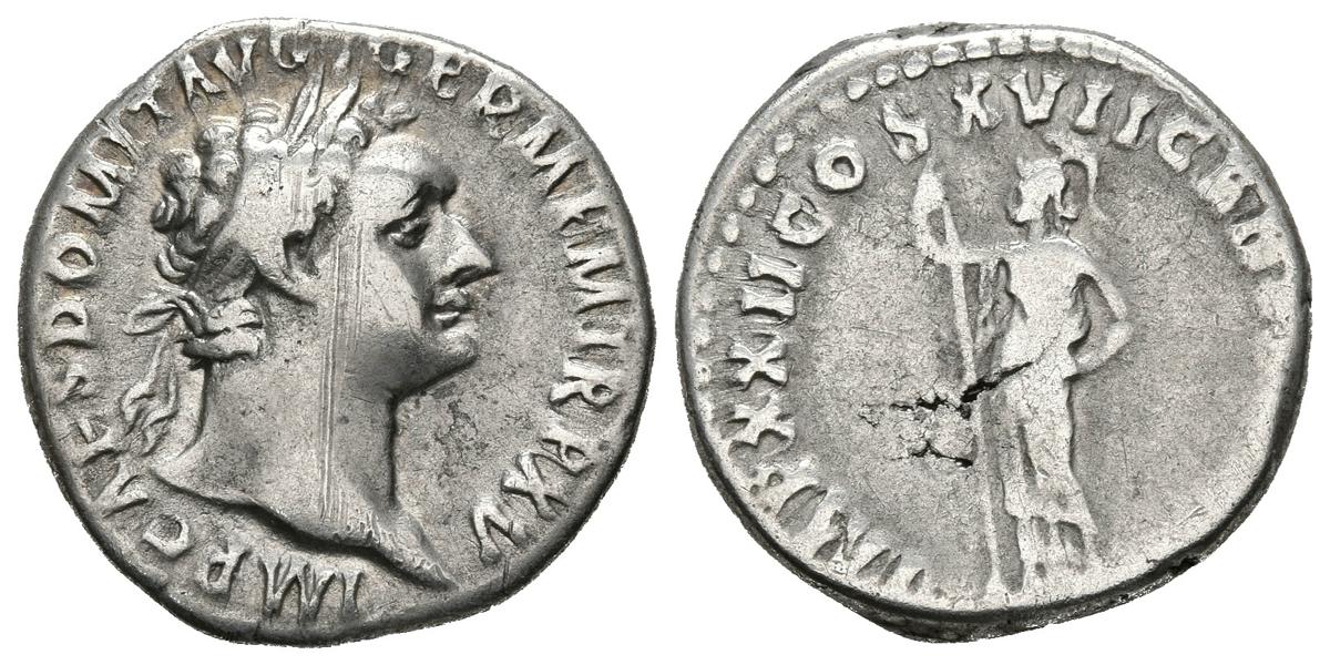 DOMITIAN. Denarius. (Ar. 3.20g / 17mm). 95-96 AD Rome. (RIC 790). Anv: Laureate head of Domitian on the right, around legend: IMP CAES DOMIT AVG GERM PM TR P XV. Rev: Minerva standing to the left carrying scepter, around legend: IMP XXII COS XVII CENS PP P. Almost Very Fine. Reverse cracks.