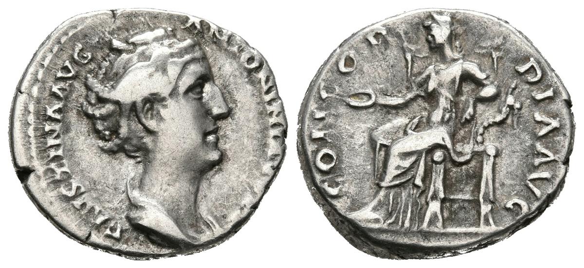 FAUSTINA I. Denario. (Ar. 3.46g / 17mm). 139 AD Rome. (RIC 327, type 2). Anv: Diademic and draped bust of Faustina I on the right, around the legend: FAVSTINA AVG ANTONINI AVG P P. Rev: Concordia sitting on the left carrying a patera and resting her left elbow on a cornucopia, around the legend: CONCORDIA AVG. Very Fine. Scarce