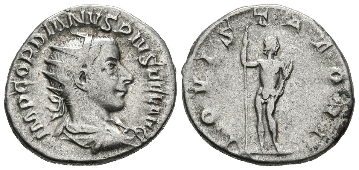 English GORDIAN III. Antoninian. (Ar. 4.18g / 21mm). 241-243 AD Rome. (RIC 85). Anv: Radiated and draped bust of Gordiano III on the right, around legend: IPM GORDIANVS PIVS FEL AVG. Rev: Jupiter standing on the right carrying thunderbolt and scepter, around legend: IOVI STATORI. Almost Very Fine.