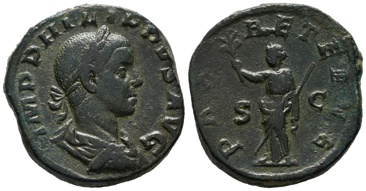 PHILIPPO II. Sestercio (Ae. 21.03g / 28mm). 246-249 AD Rome. (RIC 268). Anv: laureate bust to the right and around legend: IMP. M. IVL. PHILIPPVS AVG; Rev: Peace to the left with scepter and olive branch. Caption: PAX AETERNA. Good Very Fine.