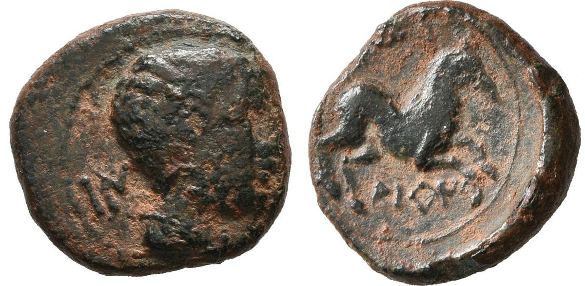 ABARILDUR (Area of Catalonia). Sextant. (Ae. 2.26g / 14mm). 120-20 BC (FAB-5). Anv: Male head to the right, behind Iberian letters: BaN. Rev: Horse to the right between Iberian legend: ABaRI / LDuR. Very Fine.