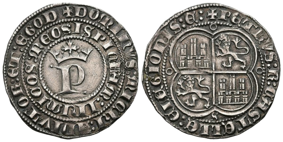 PETER I (1350-1368). 1 Real. (Ar. 3.42g / 25mm). Sevilla. (FAB-380). Anv: P crowned and around the legend: DOMINVS MICHI ADIVTOR ET EGO DISPICIAM INIMICOS MEOS. Rev: Castles and lions quartered within a quadrilobar graph, around it read: PETRVS REX CASTELLE E LEGIONIS. Almost Extremely Fine. Nice specimen, scarce like that.