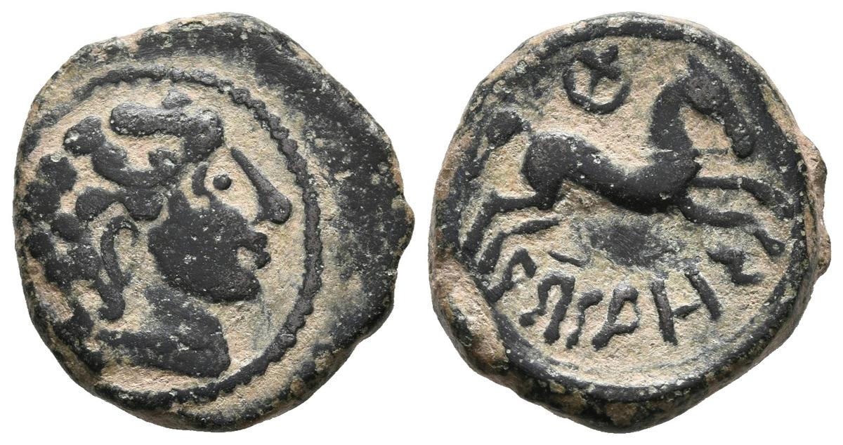 ARSAOS (Jaca, Huesca). Quadrant. (Ae. 3.38g / 17mm). 120-80 BC (FAB-152). Anv: Male head to the right. Rev: Horse with flange on the right, above crescent and star, below curved Iberian legend: ARSAOS. Very Fine. Scarce